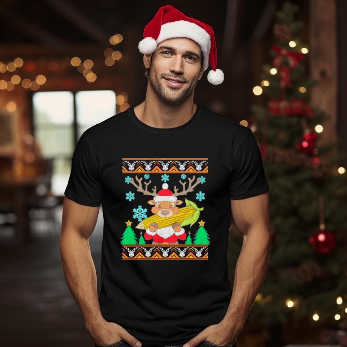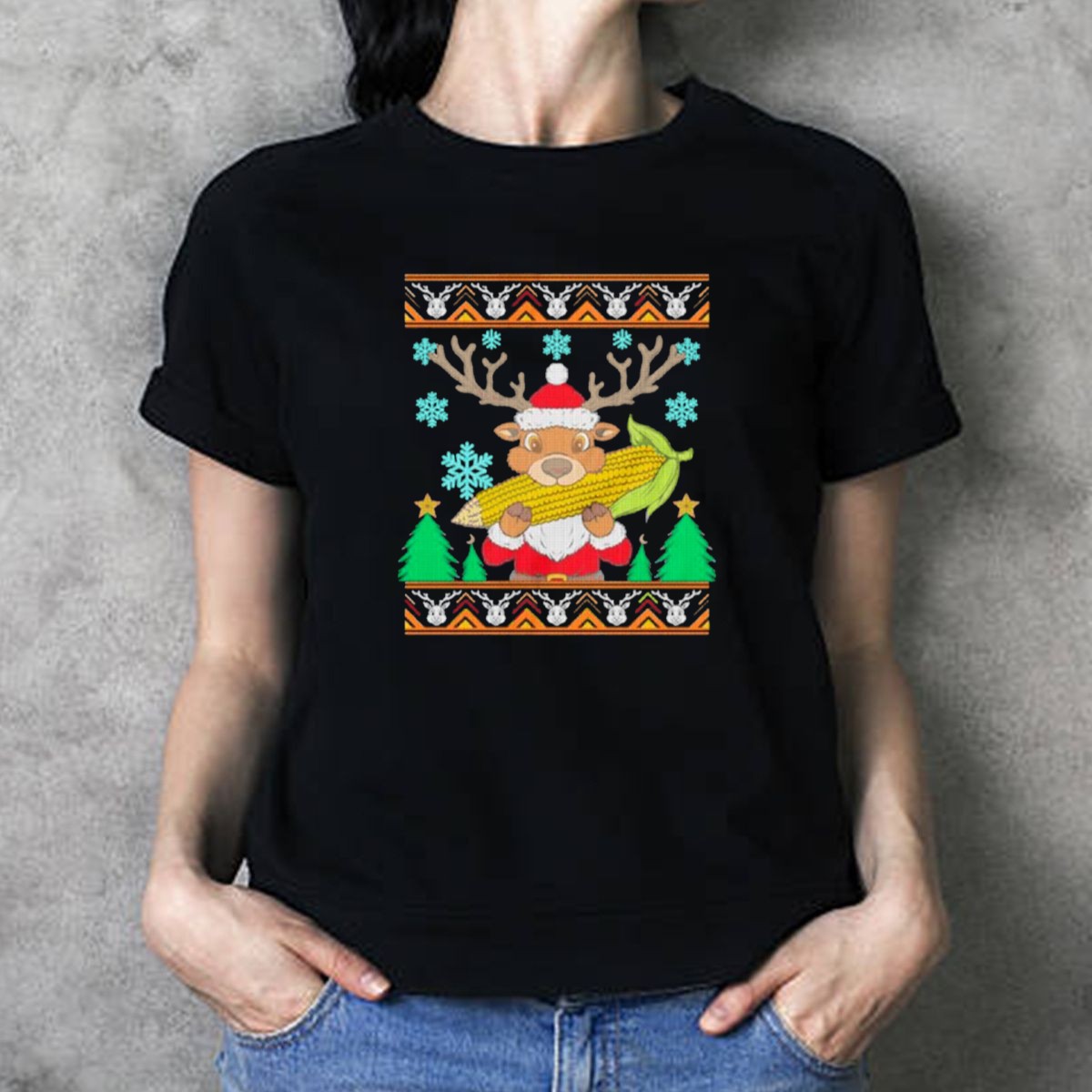 Be the first to review “Reindeer Holding Corn With Snowflakes And Trees Christmas T Shirt”
