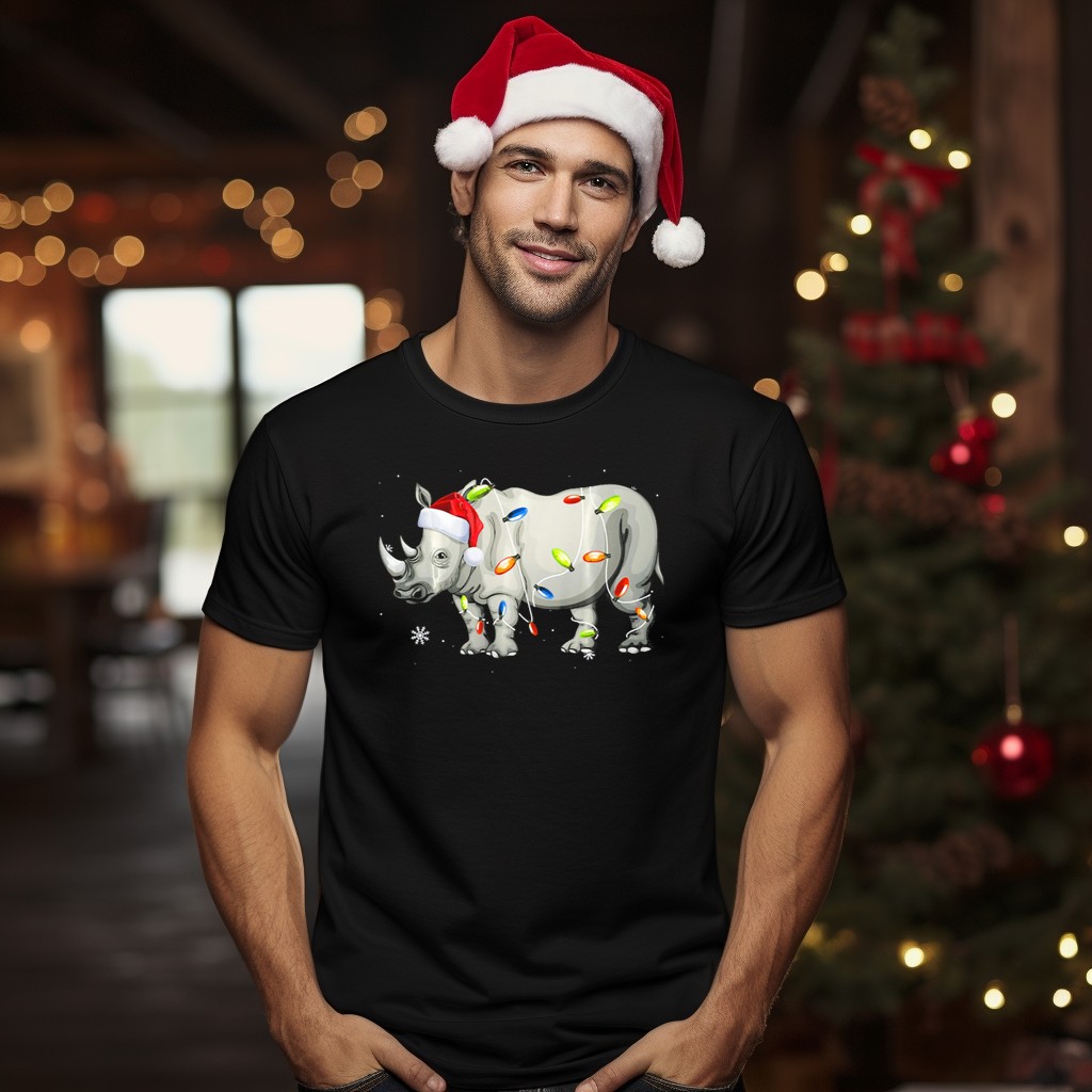 Get ready to spread holiday cheer with our Rhino Christmas Santa Hat T-Shirt! This festive tee is perfect for anyone who loves unique, fun designs that celebrate the spirit of the season. Whether you’re attending a themed event, gathering with family, or just enjoying a casual day out, this shirt is sure to turn heads and bring smiles. Featuring a colorful holiday lights design, it’s fan-made and printed right here in the USA, making it a special addition to your wardrobe this Christmas!