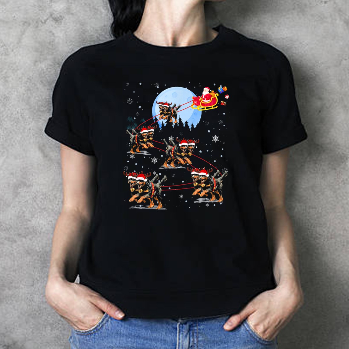 Celebrate the holiday season with our whimsical Rottweiler Reindeer Pulling Santa’s Sleigh Under Moonlight T-shirt! Perfect for dog lovers and Christmas enthusiasts alike, this fun and festive design adds a playful touch to your casual wear. Whether you’re heading to a holiday party, joining a themed event, or just spreading cheer during your daily activities, this shirt is sure to make you stand out while keeping you comfortable. Crafted with care and printed in the USA, it’s a unique addition to your festive wardrobe.