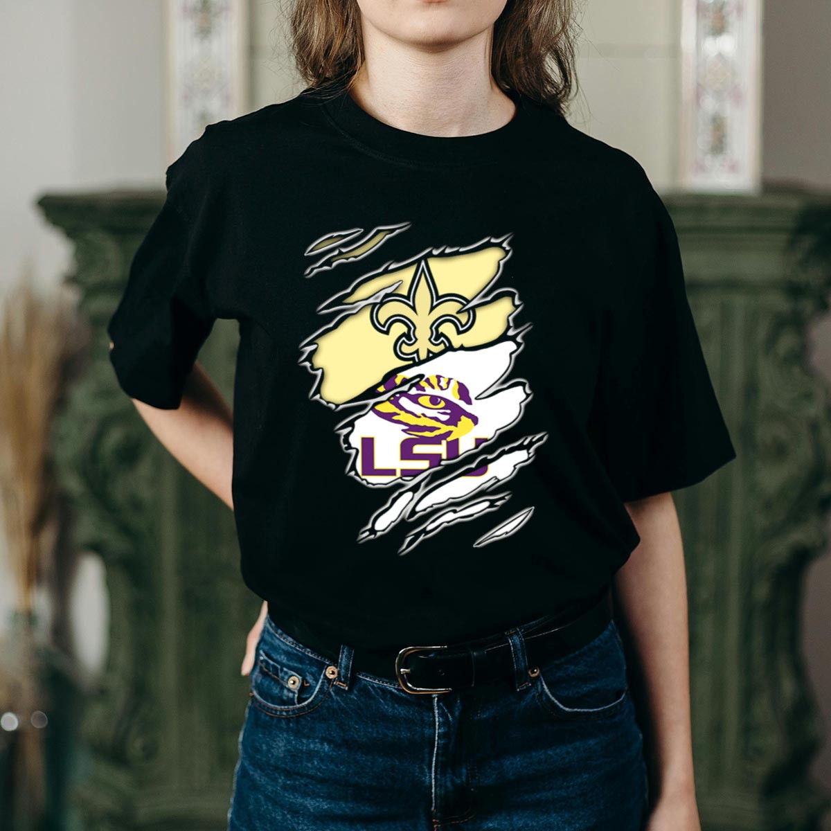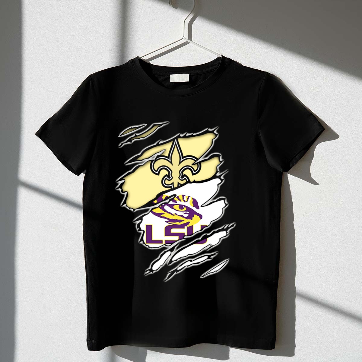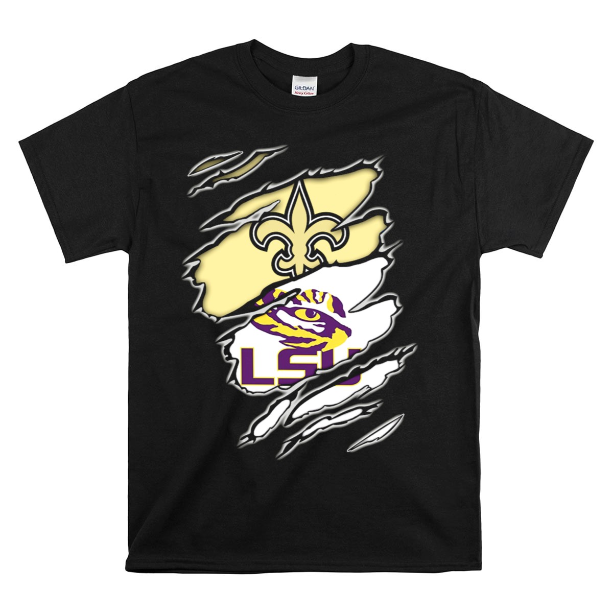 Be the first to review “Saints Fleur De Lis And Lsu Tigers Eye Logo Integration T-Shirt”