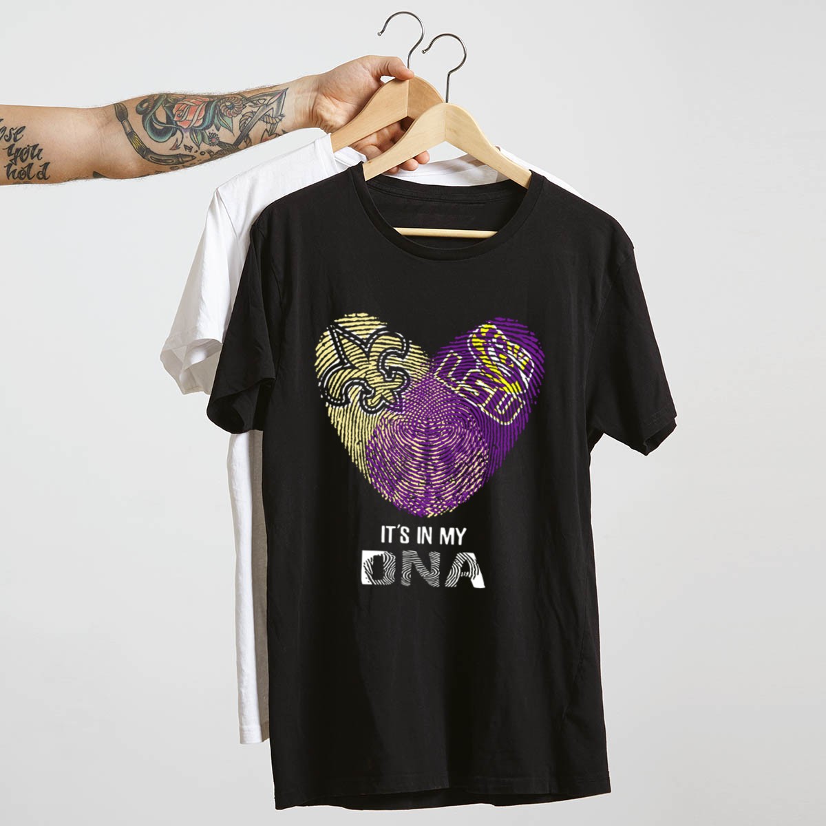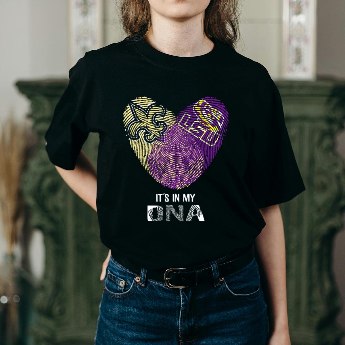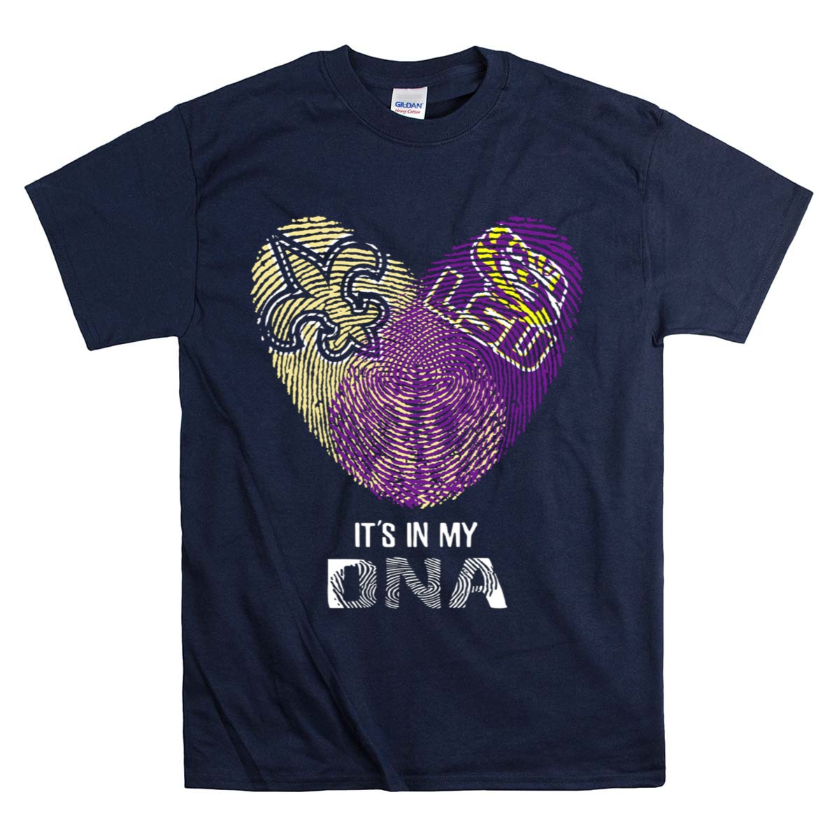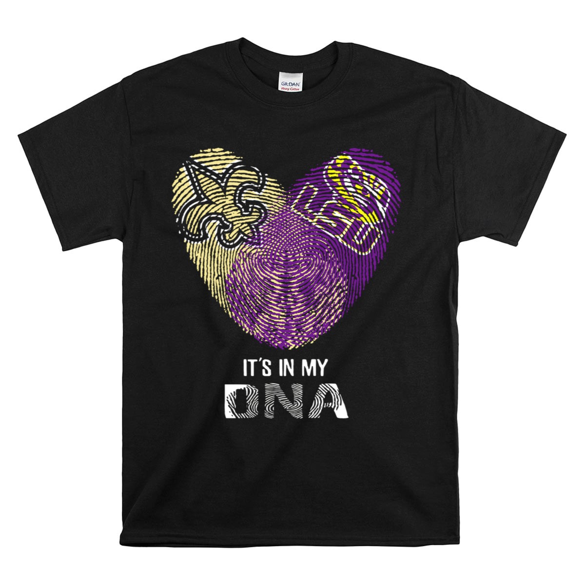 Show your fierce loyalty to the LSU Tigers with our Saints LSU It’s In My DNA Fingerprint Heart Fleur De Lis Logo T-Shirt. Perfect for die-hard fans and casual wearers alike, this shirt combines comfort and style, making it an ideal choice for game days, themed events, or simply expressing your love for the team in everyday life. Crafted with a unique fan-made design, printed right here in the USA, this T-shirt is a standout piece for anyone looking to showcase their school spirit.