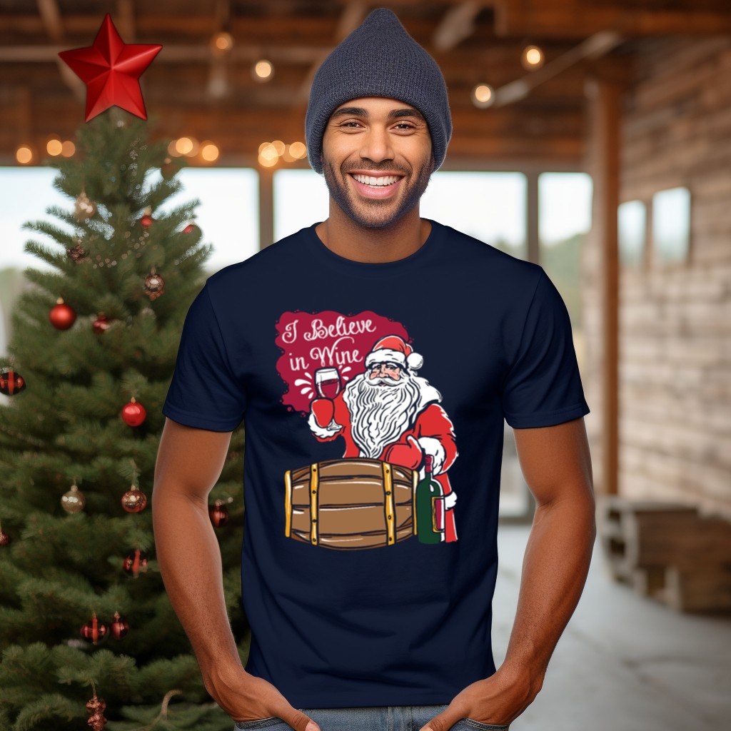 Celebrate the holiday spirit with our Santa Christmas “I Believe In Wine” T-Shirt, perfect for wine lovers and festive gatherings alike! This fan-made design features a whimsical Santa with a charming barrel and glass, making it an ideal choice for casual wear, themed events, or simply spreading cheer during the holiday season. Crafted for comfort and style, it’s a must-have addition to your wardrobe for all-season festivities.