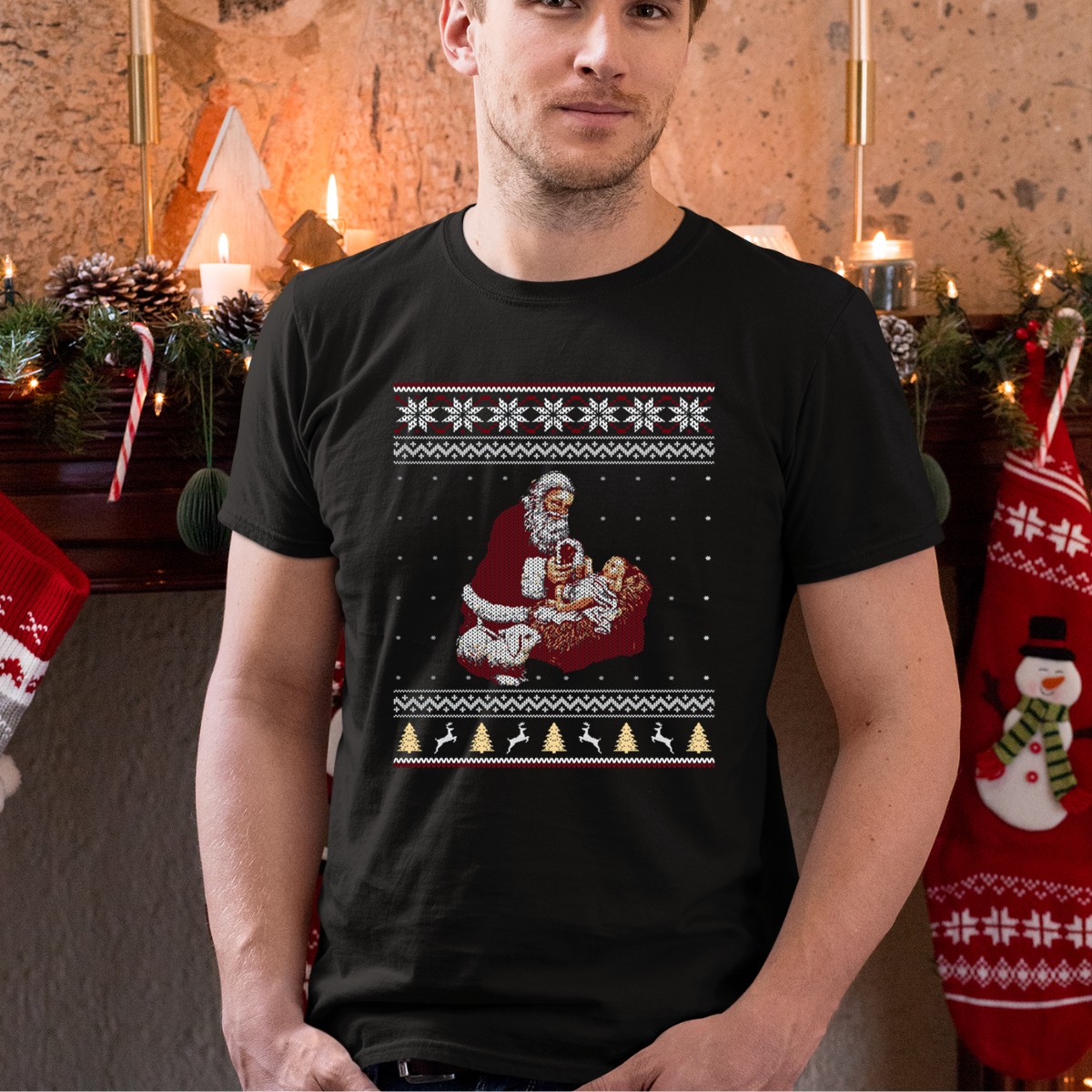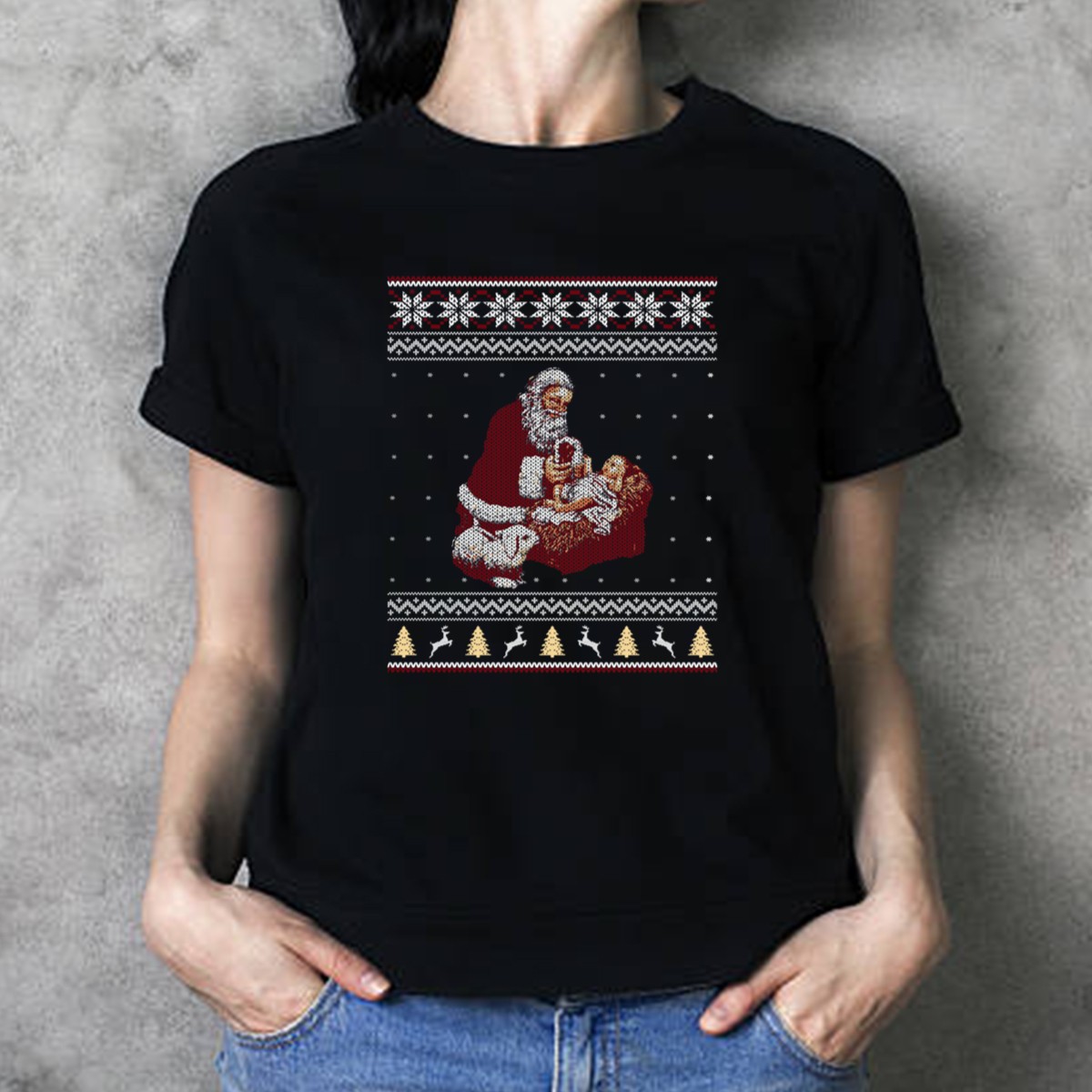 Celebrate the magic of the holiday season with our whimsical Santa Claus Knitting Baby Jesus Nativity Manger Reindeer Snowflakes T-Shirt! Perfect for Christmas gatherings, themed events, or just casual wear, this fan-made design showcases a heartwarming scene that captures the spirit of giving and joy. Made for those who love to spread cheer, this shirt is a delightful addition to your festive wardrobe.