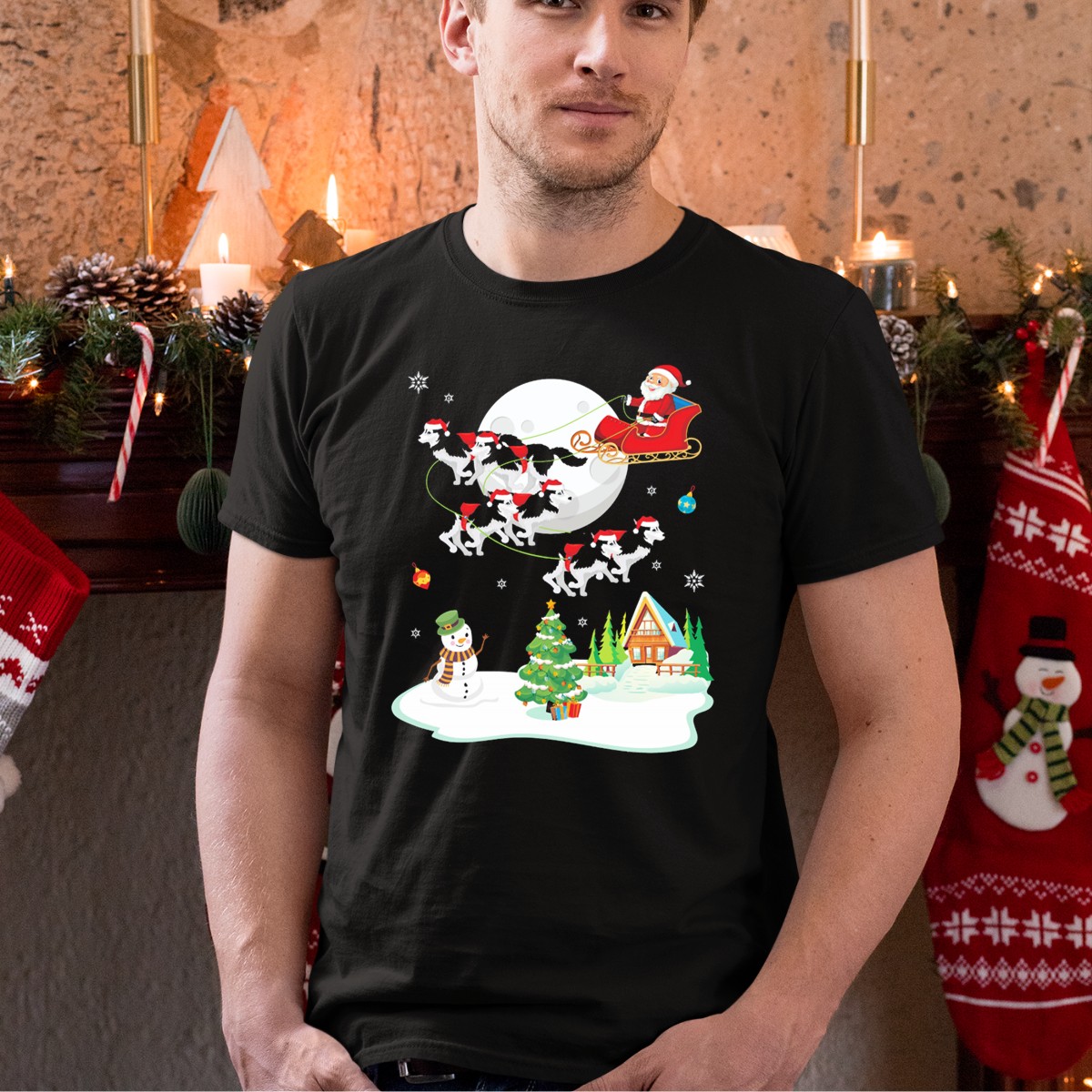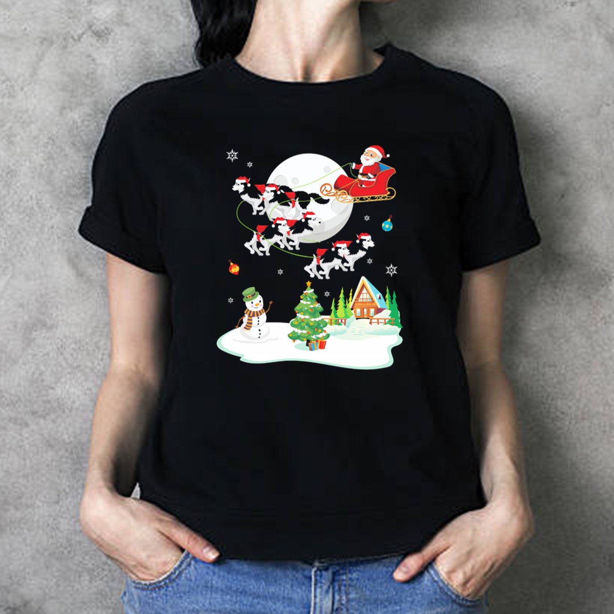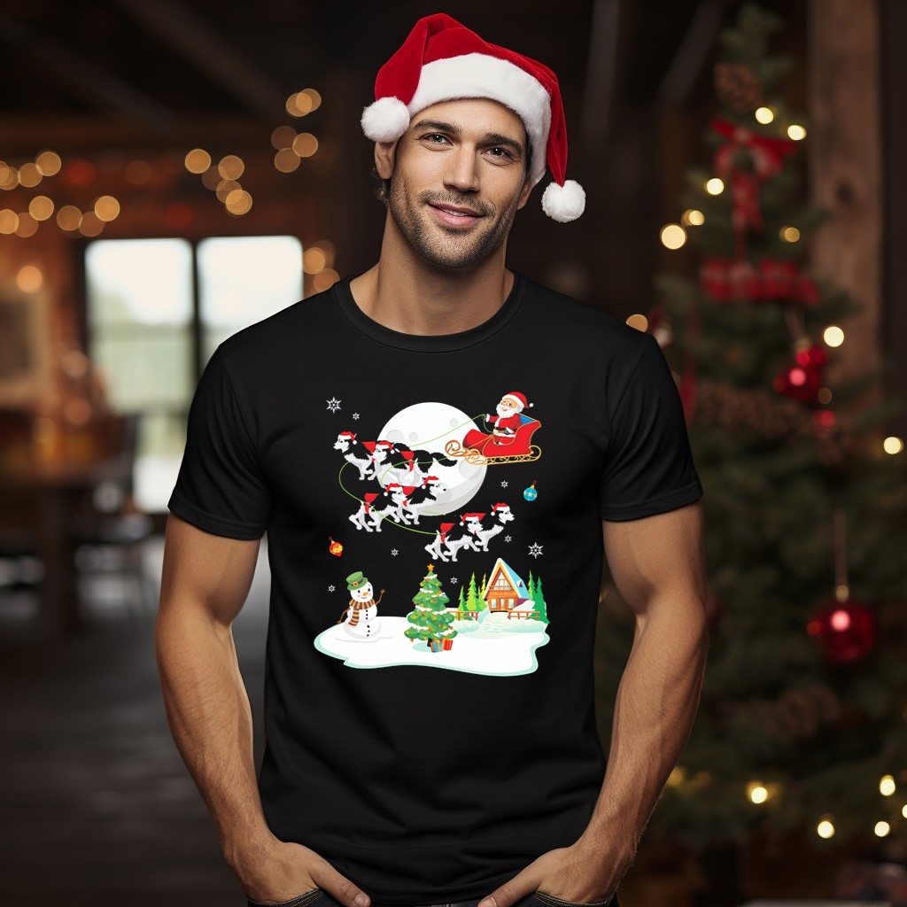 Be the first to review “Santa Claus Sleigh Ride With Husky Dogs Over Snowman And Christmas Tree Scene T-Shirt”