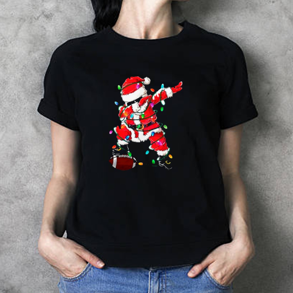 Get ready to spread some holiday cheer with our fun and festive “Santa Dabbing With Christmas Lights And Football” T-shirt! Perfect for any Christmas gathering or themed event, this shirt is designed for those who love to celebrate the season with a touch of humor and style. Featuring a playful Santa caught in a dabbing pose surrounded by colorful Christmas lights and a football, this fan-made design is an eye-catching addition to your casual wardrobe, making it ideal for daily wear during the holiday season.