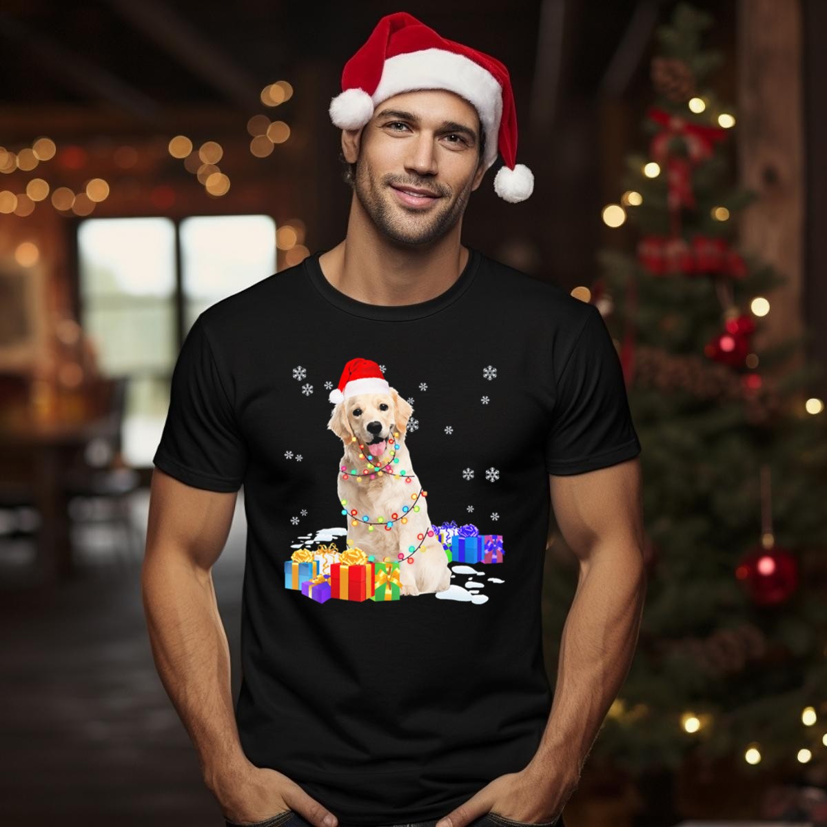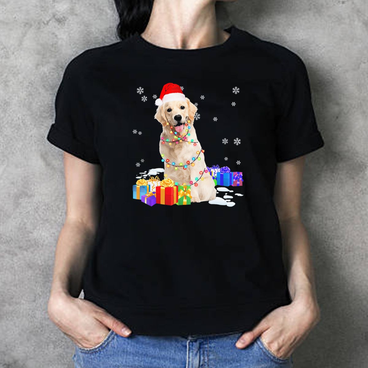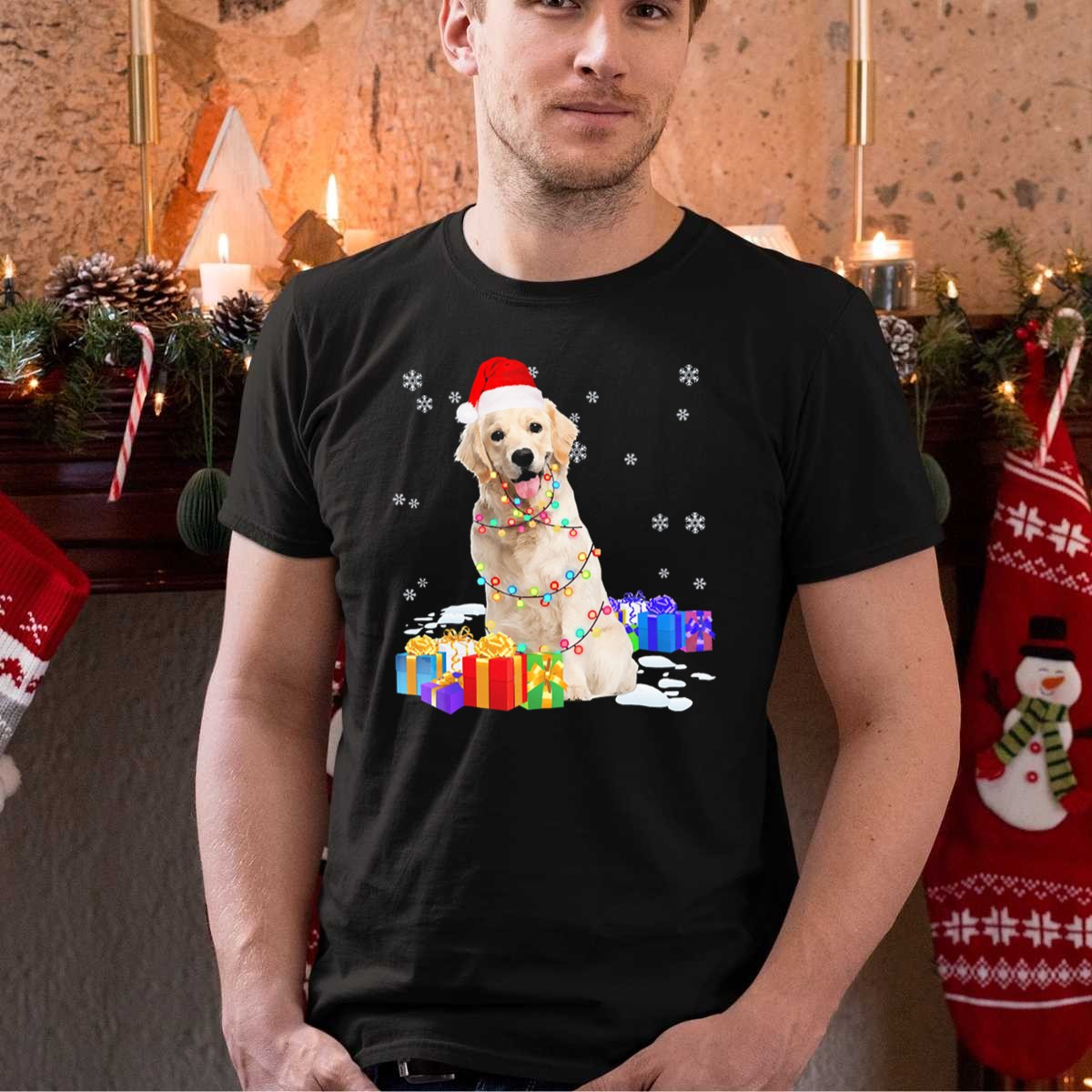 Be the first to review “Santa Golden Retriever Wrapped In Christmas Lights And Gifts T Shirt”