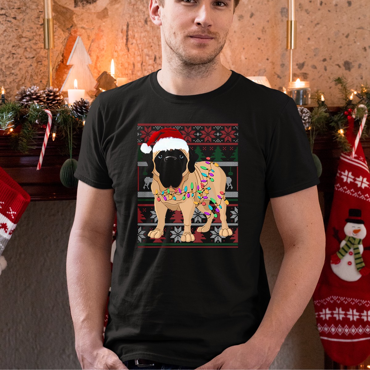 Santa Hat English Mastiff With Christmas Lights And Festive T-Shirt