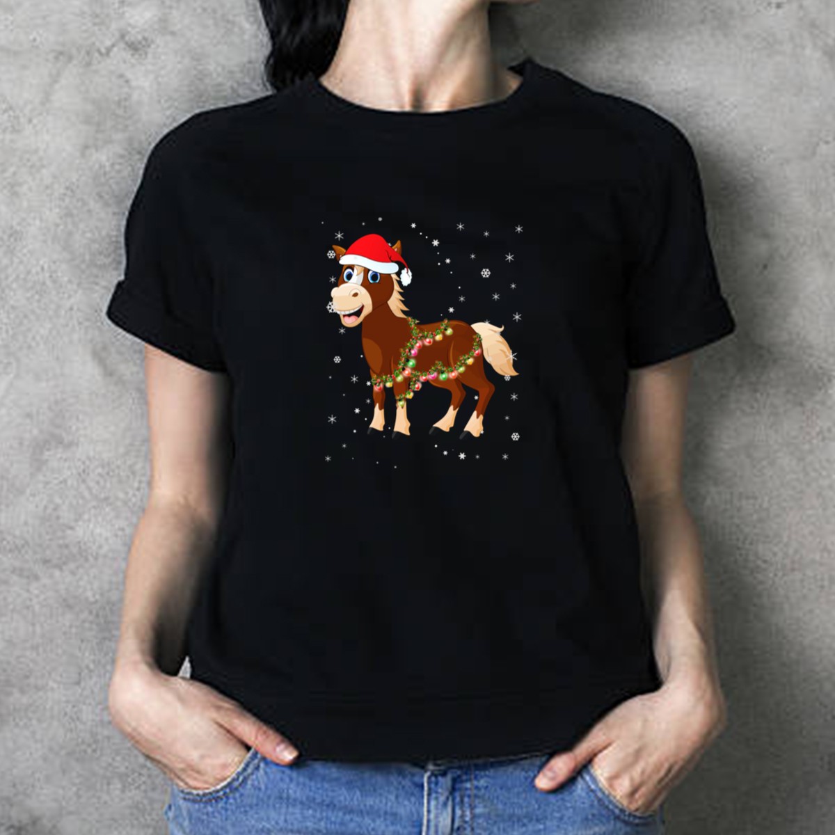 Get into the holiday spirit with our Santa Hat Horse T-Shirt, featuring a whimsical design of a horse adorned with festive Christmas lights and snowflakes. Perfect for animal lovers and holiday enthusiasts alike, this shirt is ideal for casual wear, themed events, or simply spreading cheer during the festive season. Made with high-quality materials and printed in the USA, this unique fan-made design will make you stand out at any gathering.