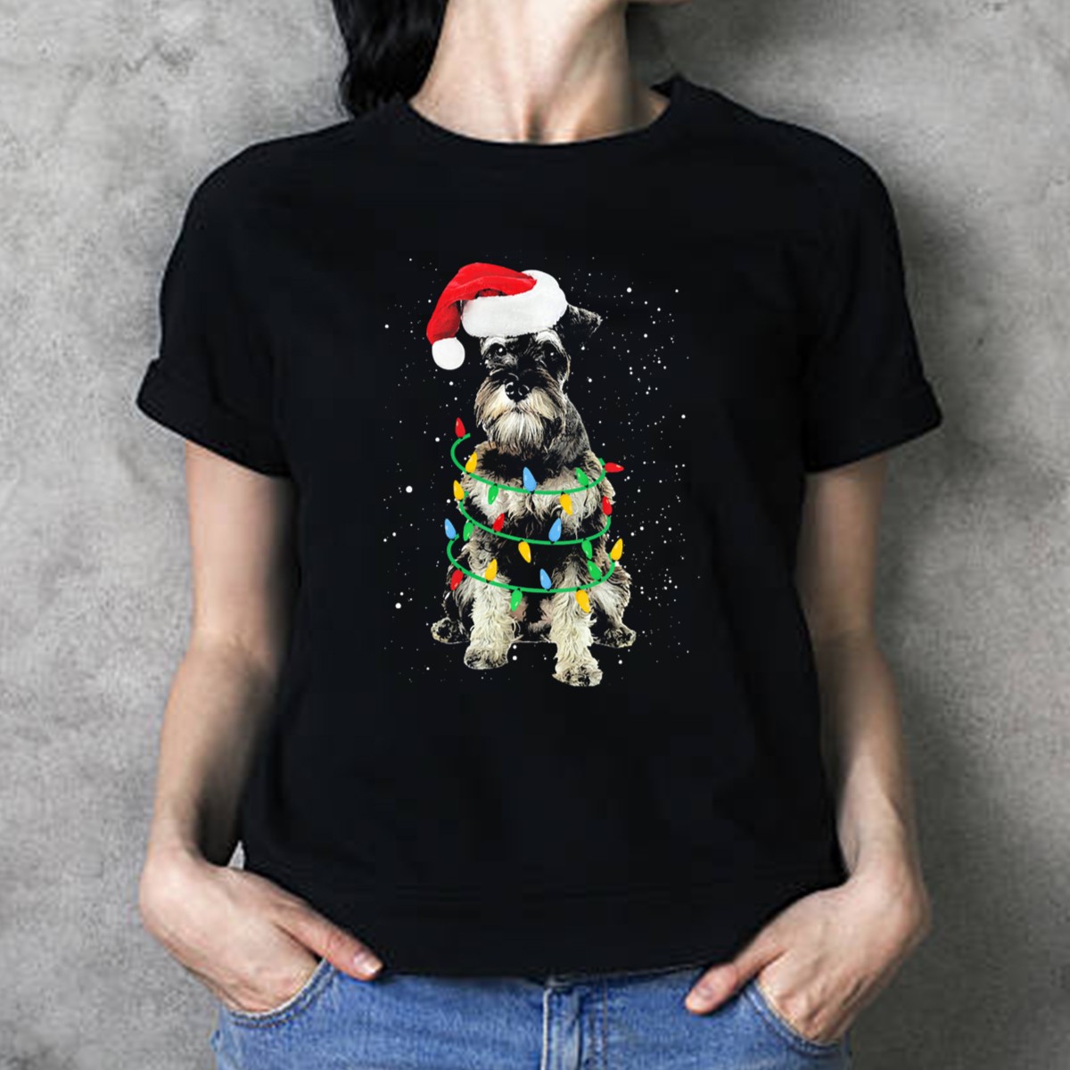 Santa Hat Miniature Schnauzer Christmas Lights T-Shirt