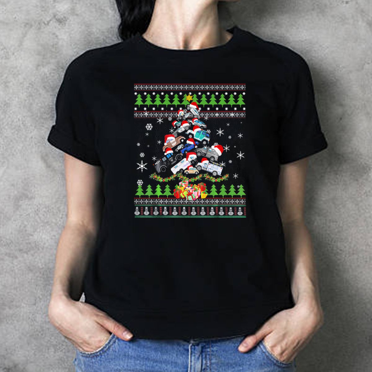 Celebrate the festive season with our Santa Hat Police Cars Christmas Tree T-Shirt, perfect for those who love to blend holiday spirit with a touch of fun! This unique design features a lively graphic of police cars adorned with Santa hats, surrounded by snowflakes and gifts, making it an ideal choice for casual wear, themed events, or daily outings during the holidays. Crafted for comfort and style, this shirt is sure to spread cheer wherever you go!
