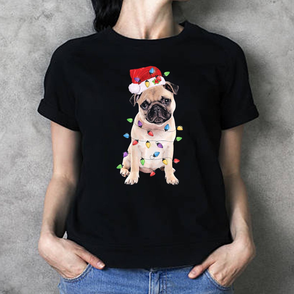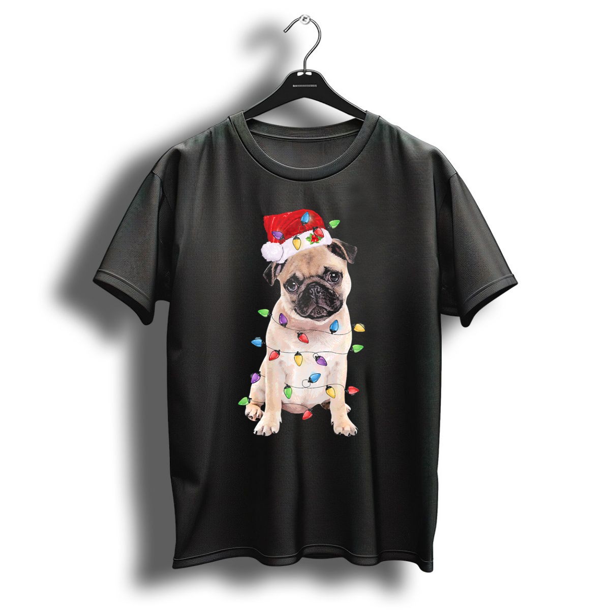 Be the first to review “Santa Hat Pug Wrapped In Colorful Christmas Lights T Shirt”