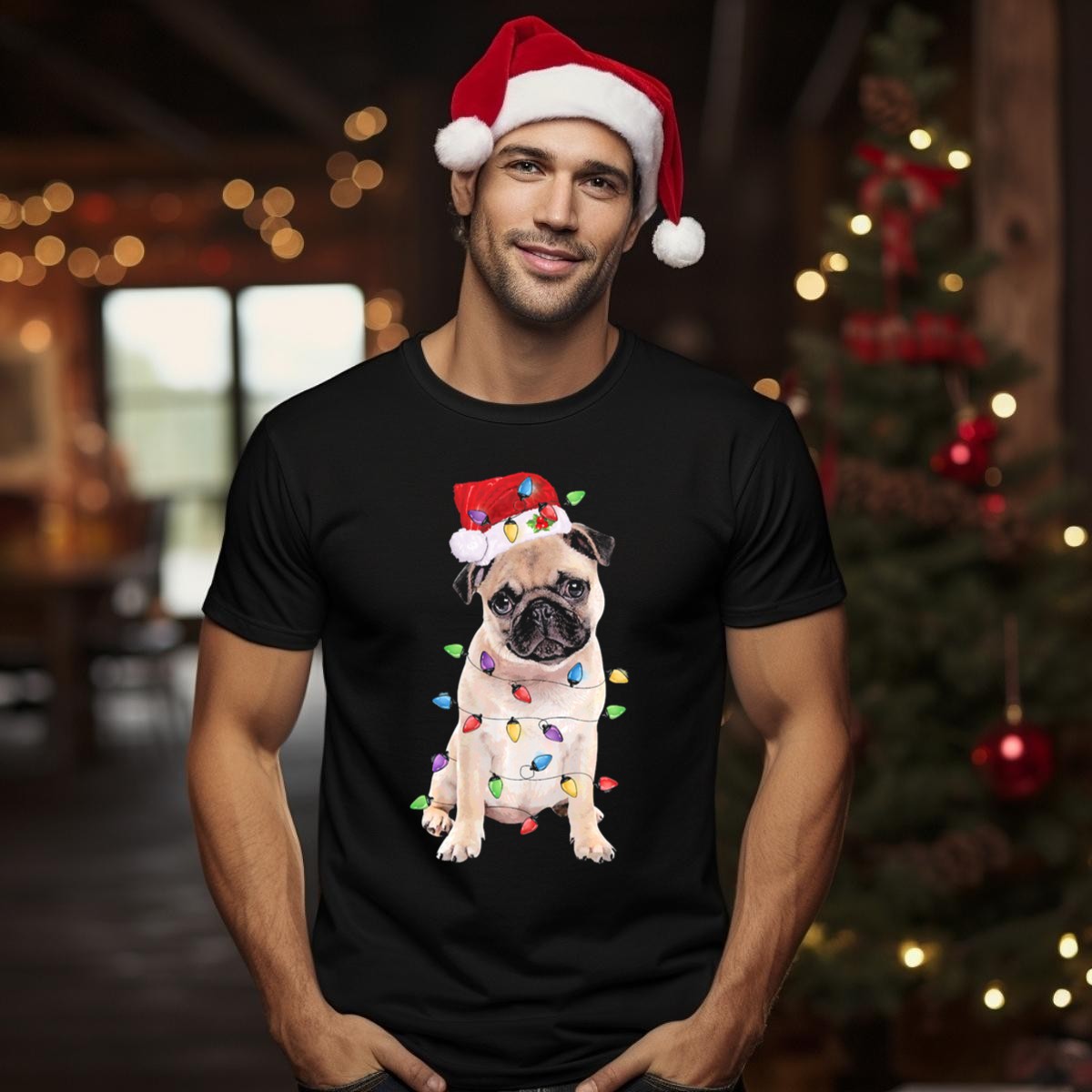 Get into the festive spirit with our Santa Hat Pug Wrapped In Colorful Christmas Lights T-Shirt! Perfect for dog lovers and holiday enthusiasts alike, this shirt brings a playful touch to your casual wardrobe. Whether you’re attending a themed event, gathering with family, or simply enjoying a cozy day at home, this fun design will keep you stylish and comfortable all season long. Made with care in the USA, it’s a unique fan-made piece that celebrates the joy of Christmas through the eyes of a lovable pug!