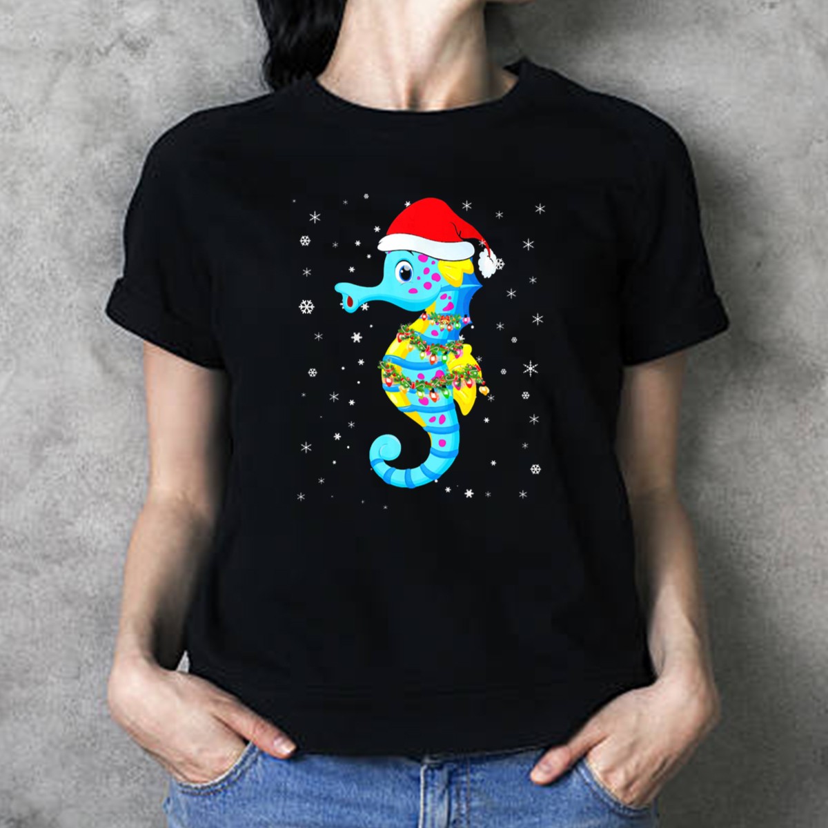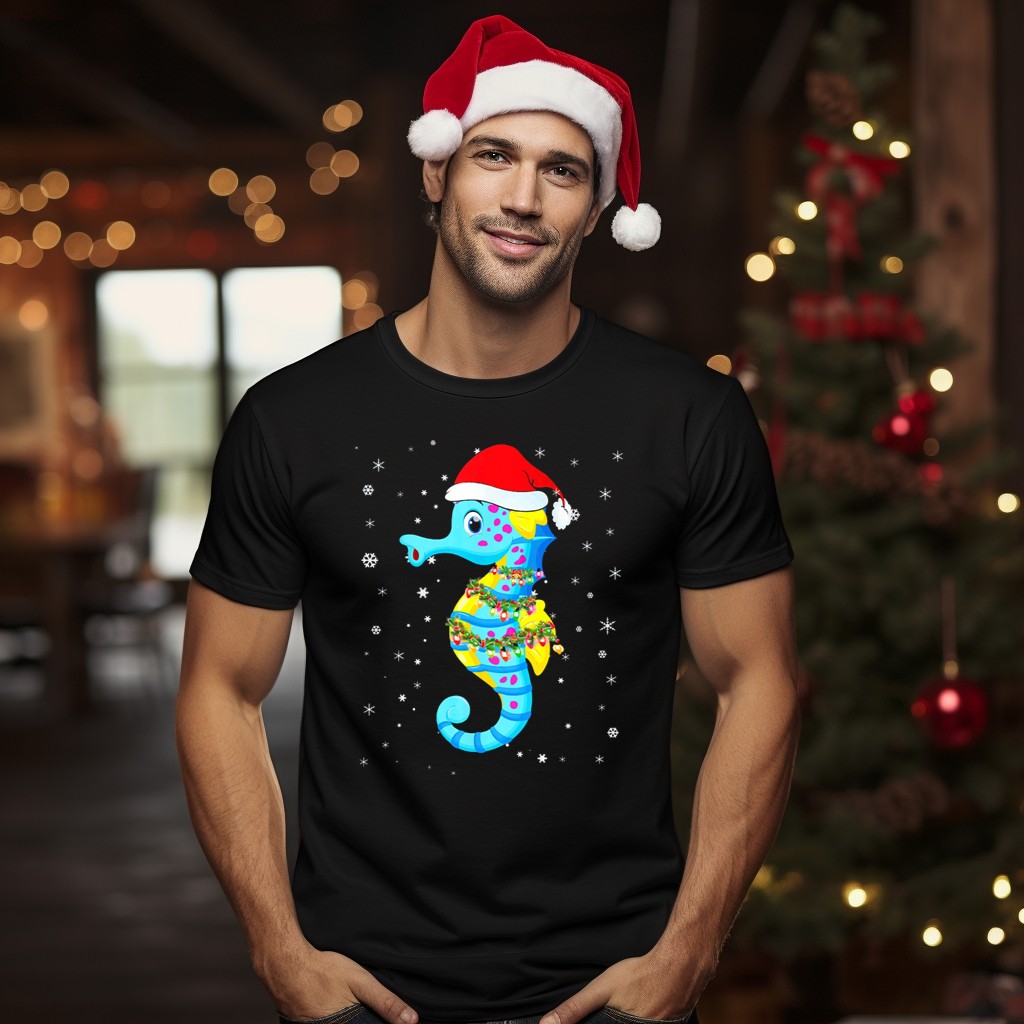 Celebrate the holiday season in style with our Santa Hat Seahorse T-shirt, featuring a whimsical design of a seahorse adorned with Christmas lights and snowflakes. This fan-made graphic tee is perfect for ocean lovers and festive spirits alike, making it an ideal choice for casual wear, themed events, or just spreading holiday cheer during daily activities. Crafted for comfort and durability, this shirt is sure to become a seasonal favorite!
