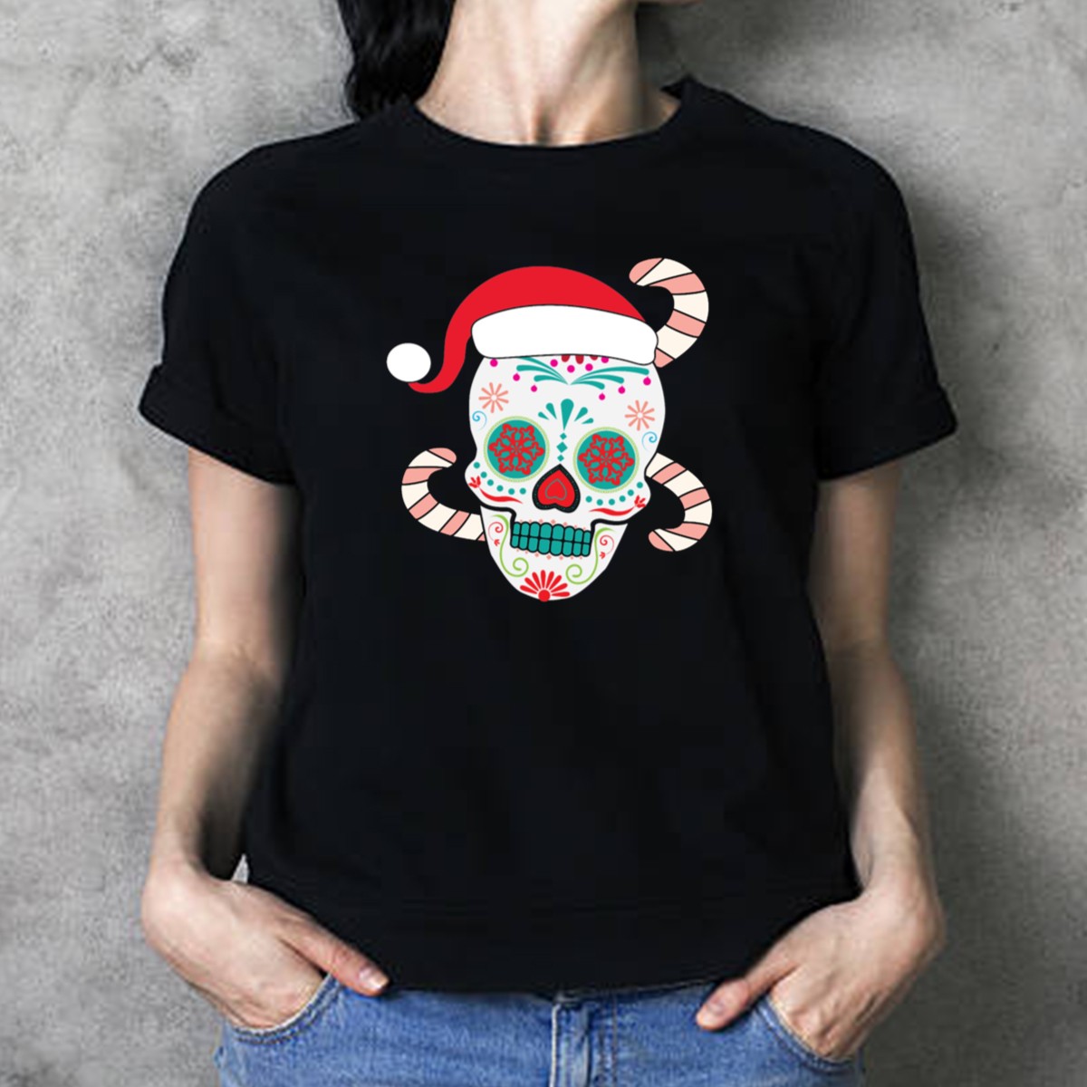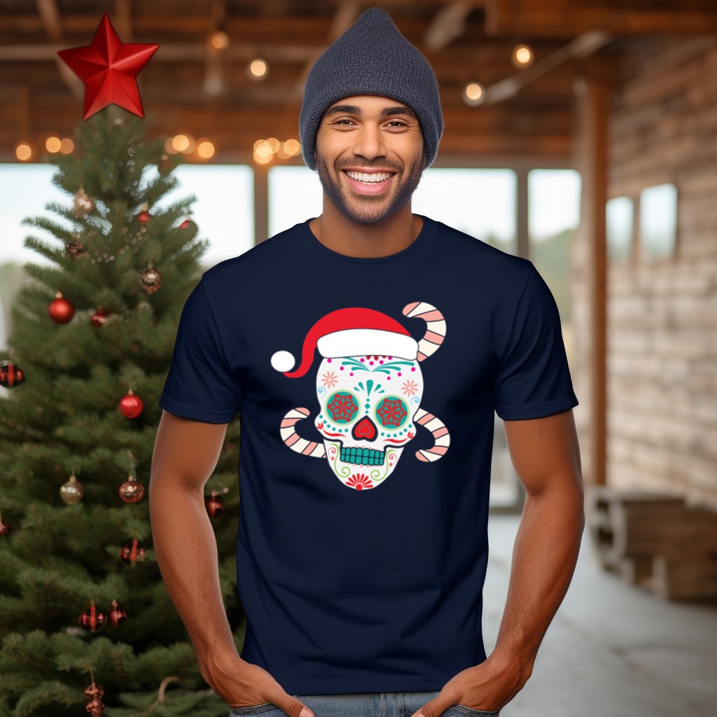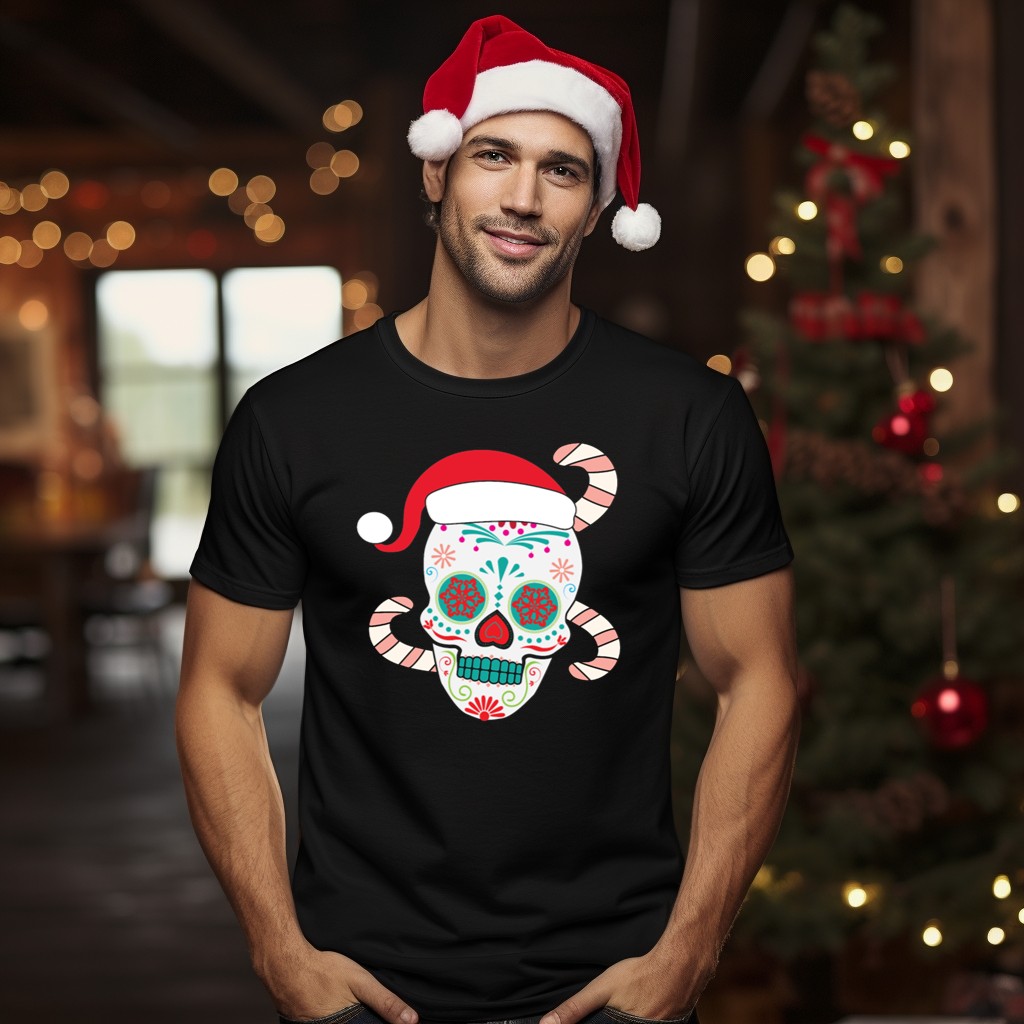 Embrace the holiday spirit with our Santa Hat Sugar Skull with Candy Canes Christmas T-Shirt! Perfect for those who love to combine festive cheer with a touch of edgy style, this graphic tee is ideal for casual wear, themed events, or your daily adventures during the holiday season. Made with a unique fan-made design printed right here in the USA, it’s sure to become a favorite in your wardrobe.