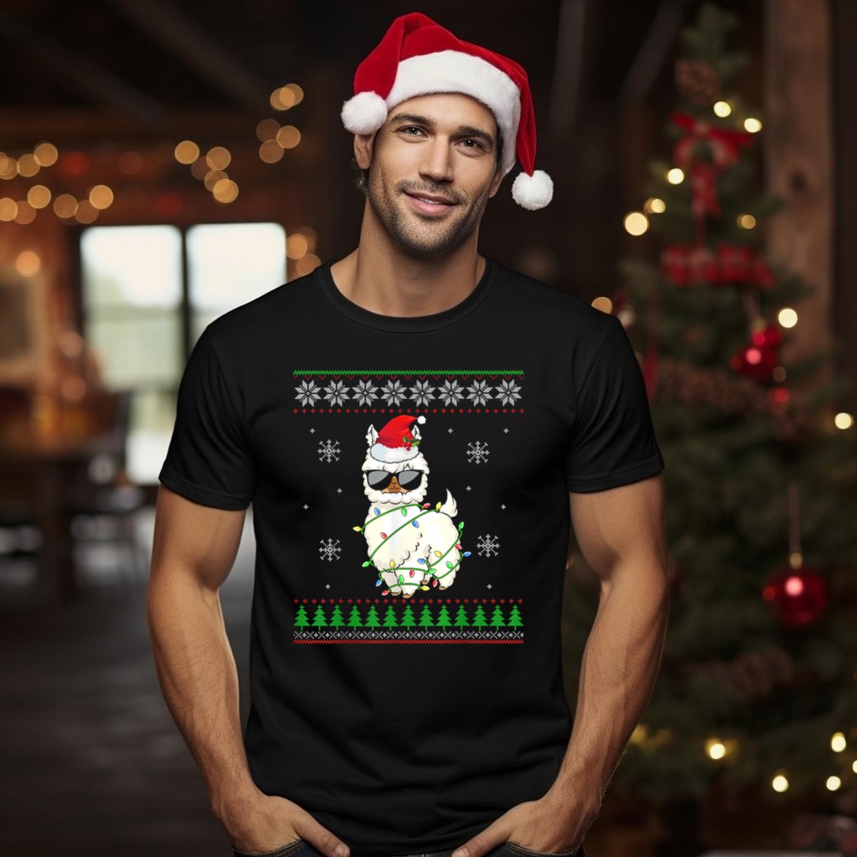 Be the first to review “Santa Hat Sunglasses Llama Wrapped In Christmas Lights With Snowflakes And Trees T Shirt”