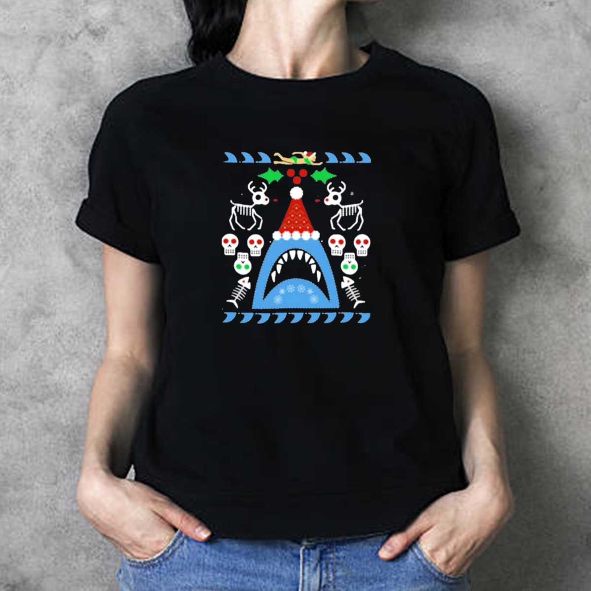 Santa Jaws Ugly Christmas Sweater With Shark Skeleton Reindeer And Skulls T-Shirt