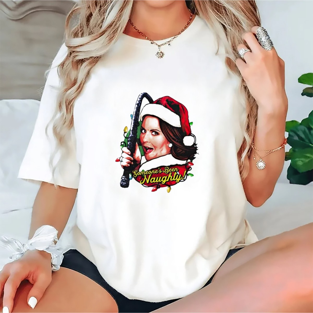 Santa Karen Walker Someone'S Been Naughty Christmas Lights Whip T-Shirt