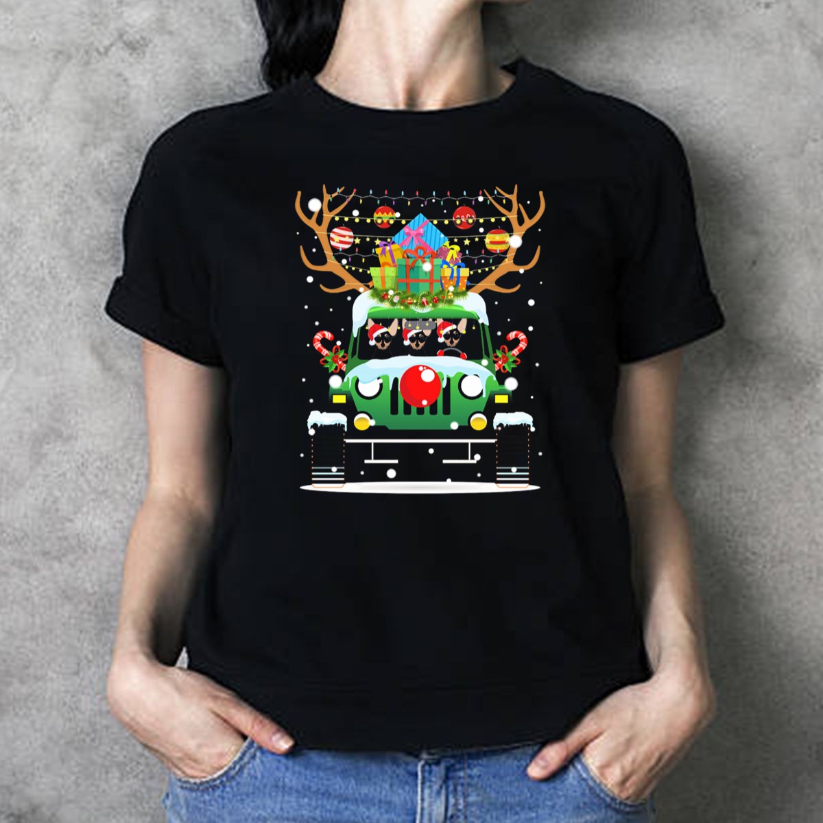 Get into the festive spirit with our Santa Miniature Pinscher Jeep T-Shirt! This fun and whimsical design features a charming Miniature Pinscher sporting reindeer antlers, driving a jeep adorned with Christmas decorations. Perfect for dog lovers and holiday enthusiasts alike, this shirt is ideal for casual wear, themed events, or simply spreading cheer during the holiday season. Made with a fan-made design and printed in the USA, it’s a unique addition to your all-season wardrobe!