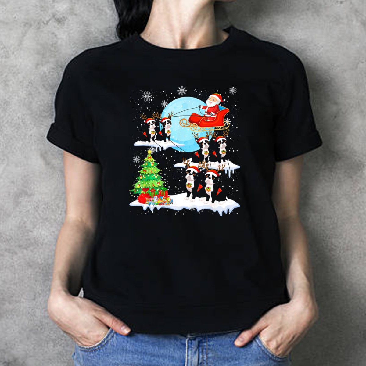 Santa Sleigh With Boston Terrier Reindeer And Christmas Tree T-Shirt