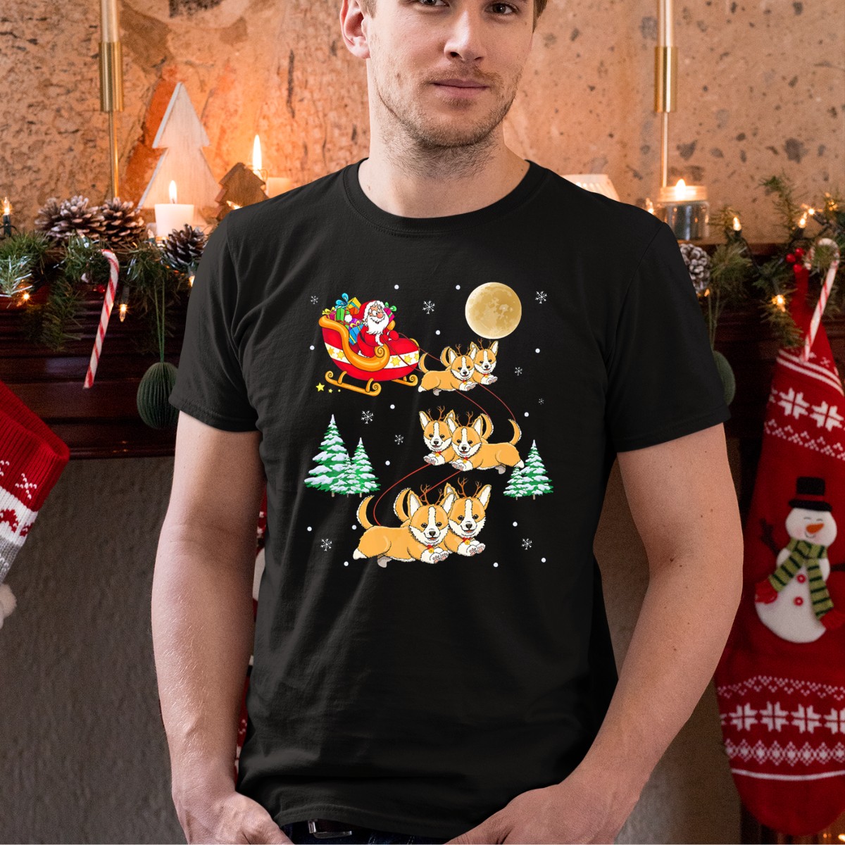 Be the first to review “Santa Sleigh With Corgi Reindeer And Full Moon Christmas Scene T-Shirt”