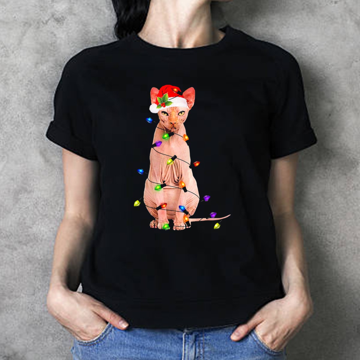 Be the first to review “Santa Sphynx Cat Wrapped In Colorful Christmas Lights T-Shirt”