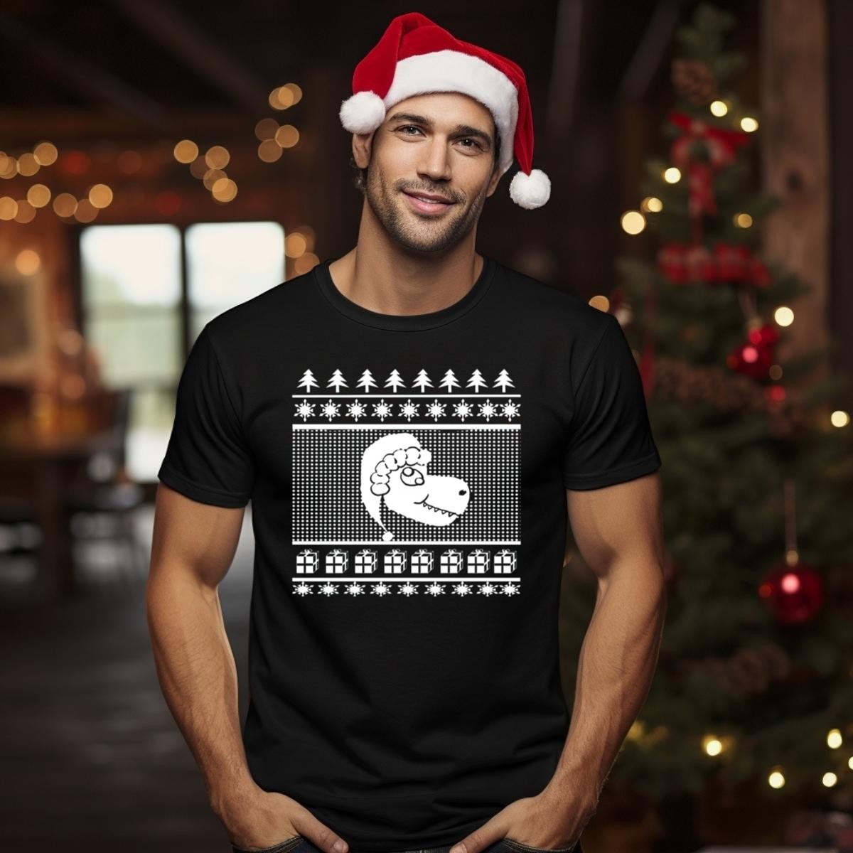 Get ready to spread holiday cheer with our Santa Trex Ugly Christmas Sweater Style Dinosaur T-Shirt! Perfect for dinosaur lovers and holiday enthusiasts alike, this fun graphic tee combines the whimsy of a festive dinosaur wearing a Santa hat with classic Christmas elements like pine trees, snowflakes, and presents. Ideal for casual wear, themed events, or simply to brighten up your daily outfit, this shirt is sure to be a conversation starter at any holiday gathering!