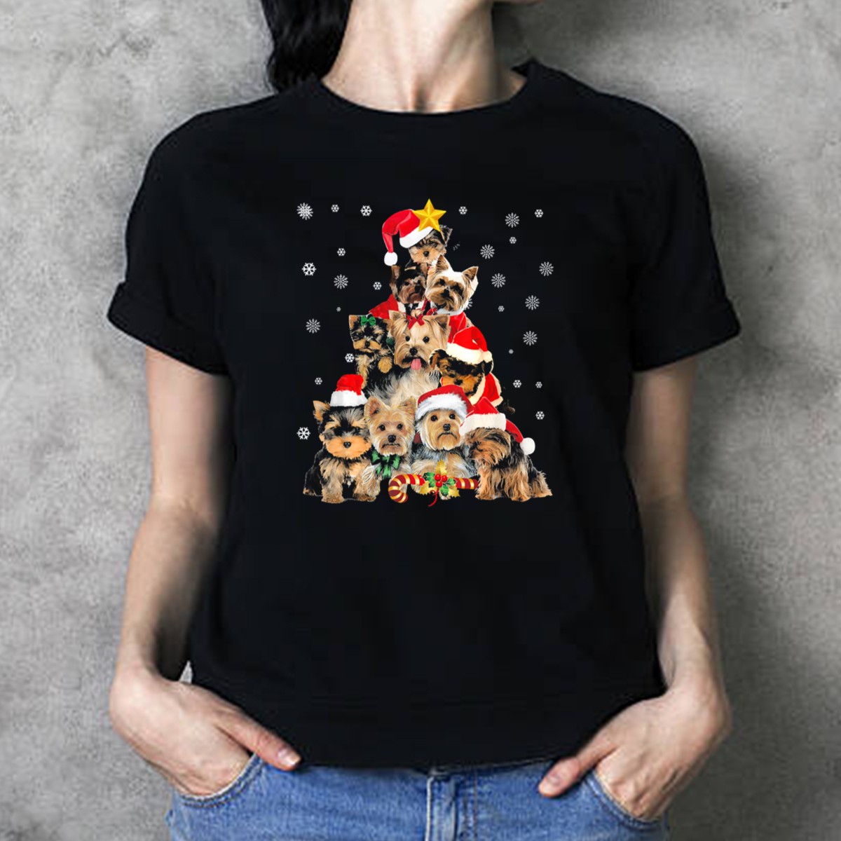 Get ready to spread some festive cheer with our Santa Yorkie Christmas Tree T-Shirt! Perfect for dog lovers and holiday enthusiasts alike, this whimsical design features an adorable Yorkie dressed as Santa surrounded by snowflakes and candy canes. It’s the ideal choice for casual gatherings, themed events, or simply showcasing your holiday spirit throughout the season. Made for comfort and style, this shirt is not just a piece of clothing; it’s a celebration of all things merry!