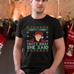 Celebrate the holiday season with a clever twist on festive cheer! The “Santa’s Coming That’s What She Said” T-shirt combines the beloved humor of Michael Scott from The Office with a playful holiday spirit. Perfect for fans and anyone looking to add a touch of fun to their casual wear, this shirt is ideal for themed events, holiday parties, or everyday comfort throughout the season. Made with a fan-made design, it’s proudly printed in the USA, making it a unique addition to your wardrobe.