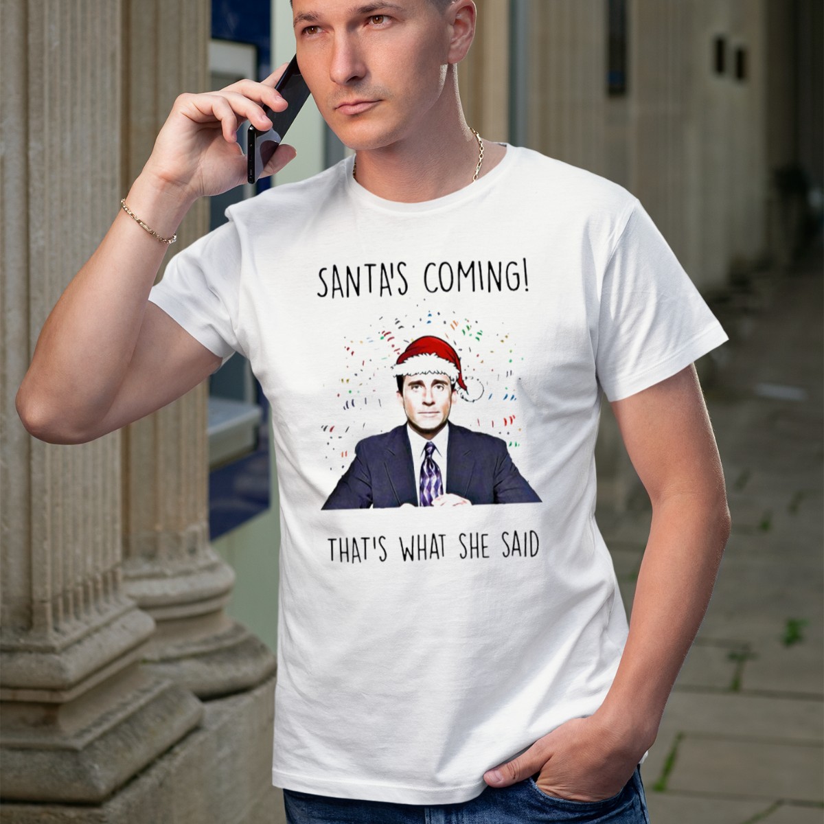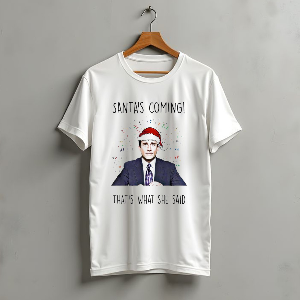Celebrate the holiday season with our fun and festive “Santa’s Coming That’s What She Said” Michael Scott Christmas T-Shirt! Perfect for fans of The Office and anyone who loves to spread cheer, this shirt is ideal for casual wear, themed events, or just lounging around during the holidays. Its unique fan-made design, printed with care in the USA, showcases your love for the iconic show while keeping you comfortable and stylish.