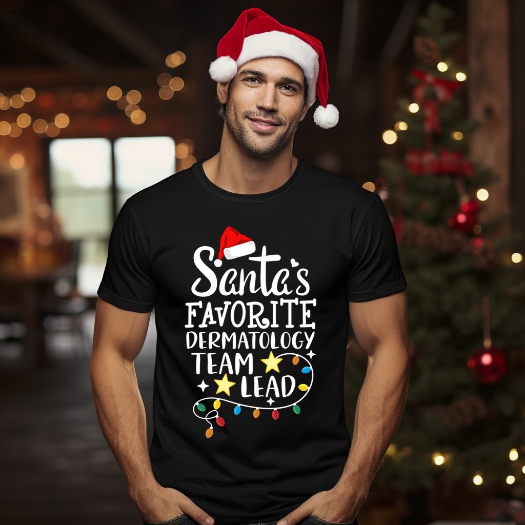 Celebrate the holiday season with a touch of humor and style in our Santa’s Favorite Dermatology Team Lead Christmas Lights And Stars T-Shirt! Perfect for dermatology professionals and festive enthusiasts alike, this unique shirt adds a playful spin to your casual wear. Whether you’re at a themed event, holiday party, or just enjoying daily activities, this shirt is sure to bring smiles and spread cheer while showcasing your love for your profession. Proudly printed in the USA, it’s a must-have for anyone wanting to keep the holiday spirit alive!