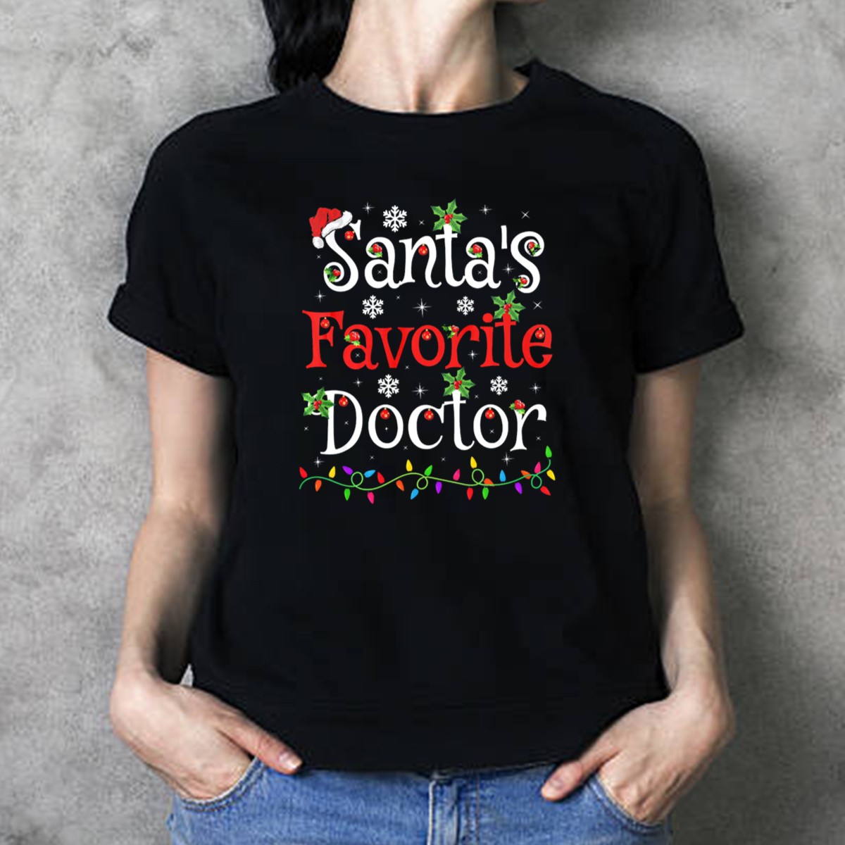Celebrate the festive season with our Santa’s Favorite Doctor Christmas Lights and Holly T-Shirt! Perfect for healthcare professionals and holiday enthusiasts alike, this playful design makes a delightful addition to your casual wardrobe or themed events. Made for comfort and style, this shirt is a fun way to spread cheer while showcasing your profession during the holidays. Printed in the USA, it’s not just a shirt; it’s a unique expression of holiday spirit!