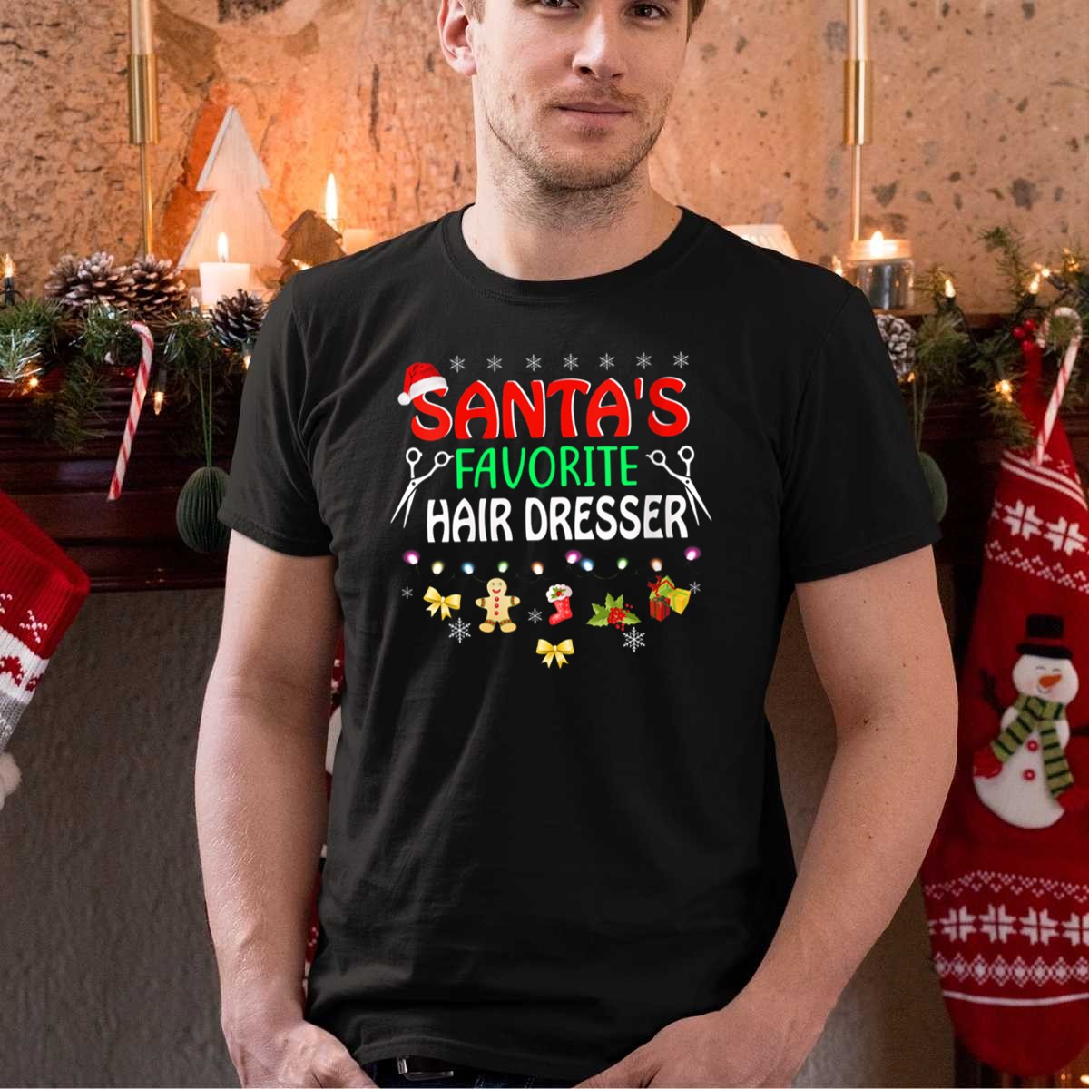 Celebrate the festive season with our “Santa’s Favorite Hair Dresser” T-shirt, perfect for hairstylists and holiday enthusiasts alike! This playful design showcases a delightful mix of Christmas lights, scissors, gingerbread ornaments, and snowflakes, making it the ideal choice for casual wear, themed events, or daily outings during the holiday season. Crafted for comfort and style, this shirt is sure to bring a smile to your face and those around you.
