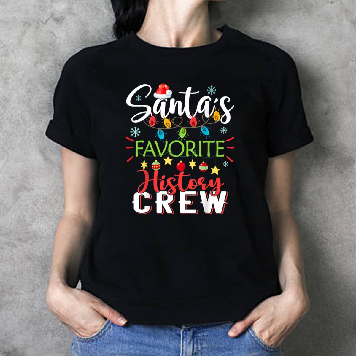 Be the first to review “Santa’S Favorite History Crew Christmas Lights Snowflakes Stars T-Shirt”
