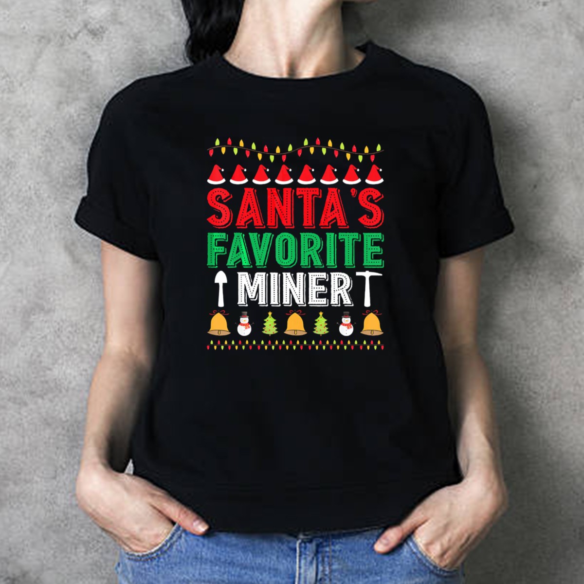 Santas Favorite Miner Christmas Trees Snowmen Bells Santa Hats Lights T-Shirt