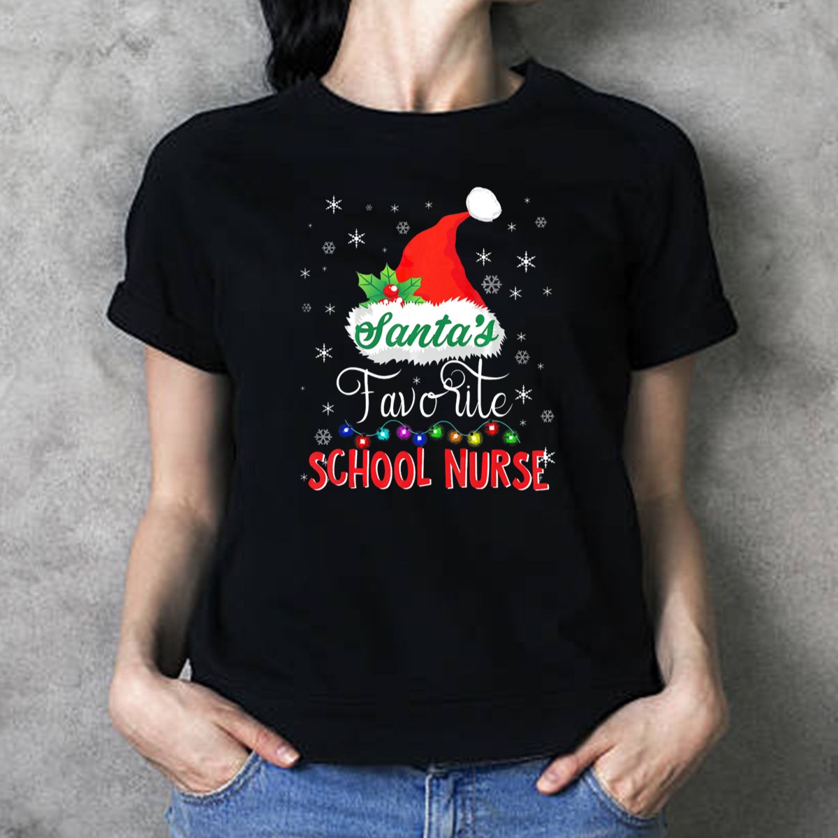 Be the first to review “Santas Favorite School Nurse Santa Hat Snowflakes And Colorful Christmas Lights T-Shirt”