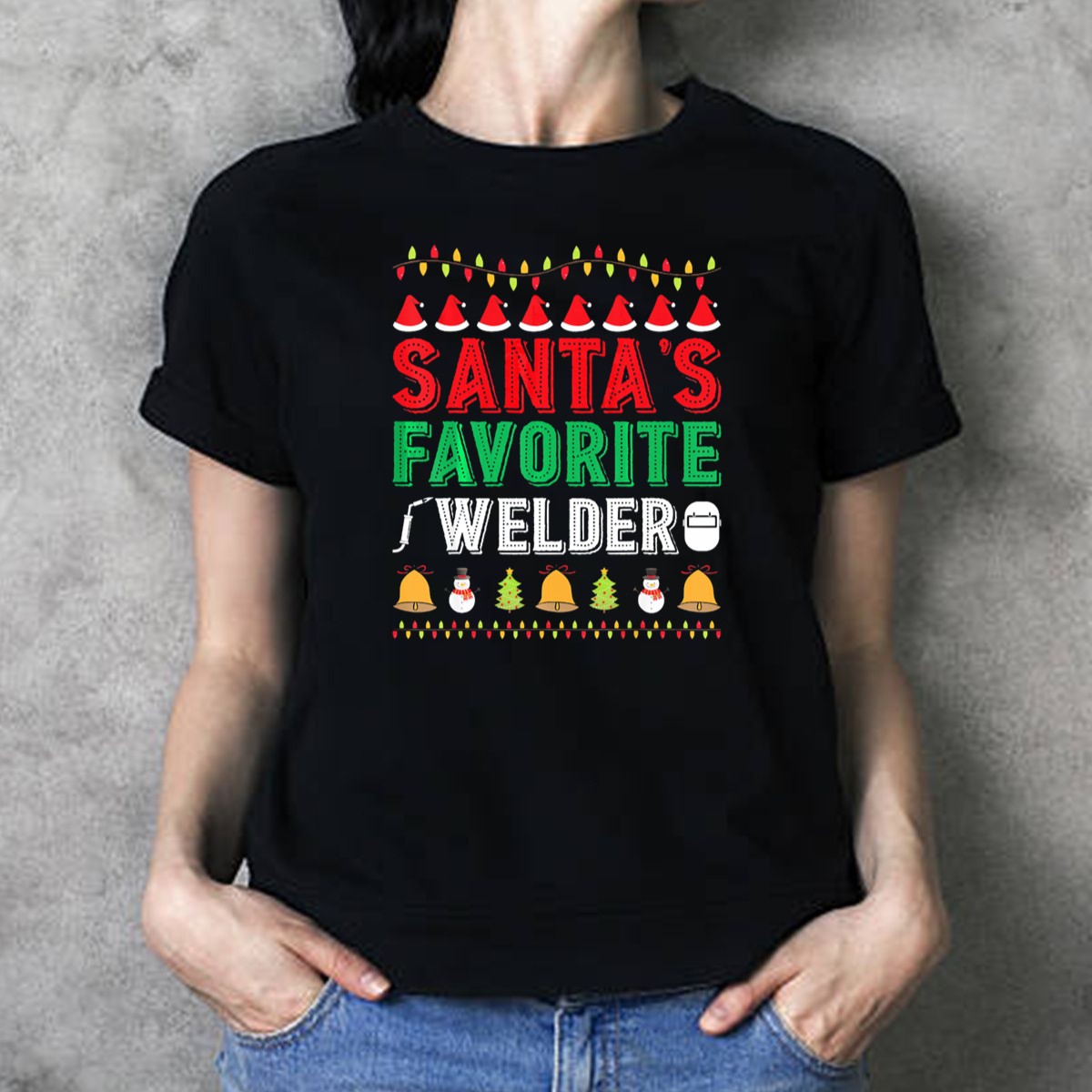 Be the first to review “Santas Favorite Welder Christmas Lights Santa Hats Snowman Bells Trees T Shirt”