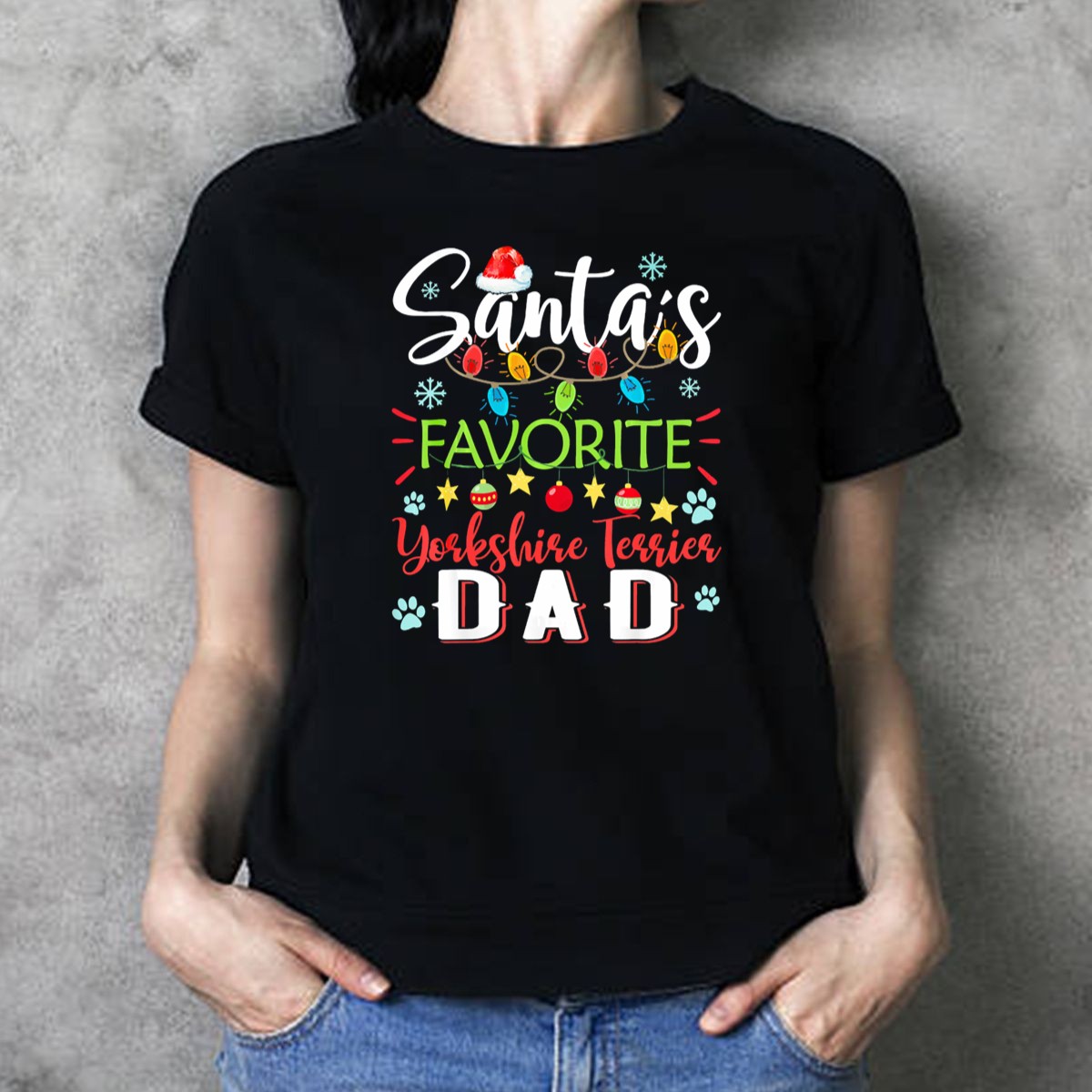 Celebrate the festive season with our “Santa’s Favorite Yorkshire Terrier Dad” T-shirt, perfect for dog lovers and proud Yorkshire Terrier parents! This fan-made design, printed in the USA, features cheerful Christmas lights and adorable paw prints, making it a delightful addition to your casual wear collection. Ideal for themed events, family gatherings, or just lounging around during the holidays, this T-shirt showcases your love for your furry friend while spreading holiday cheer.