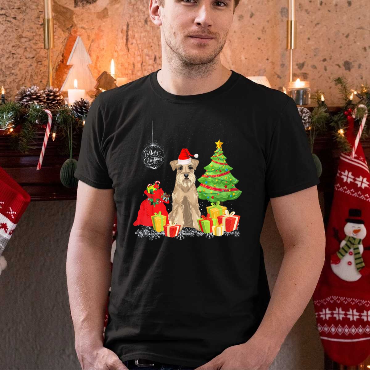 Schnauzer With Merry Christmas Santa Hat And Gifts Under Christmas Tree T Shirt