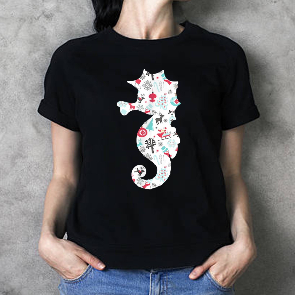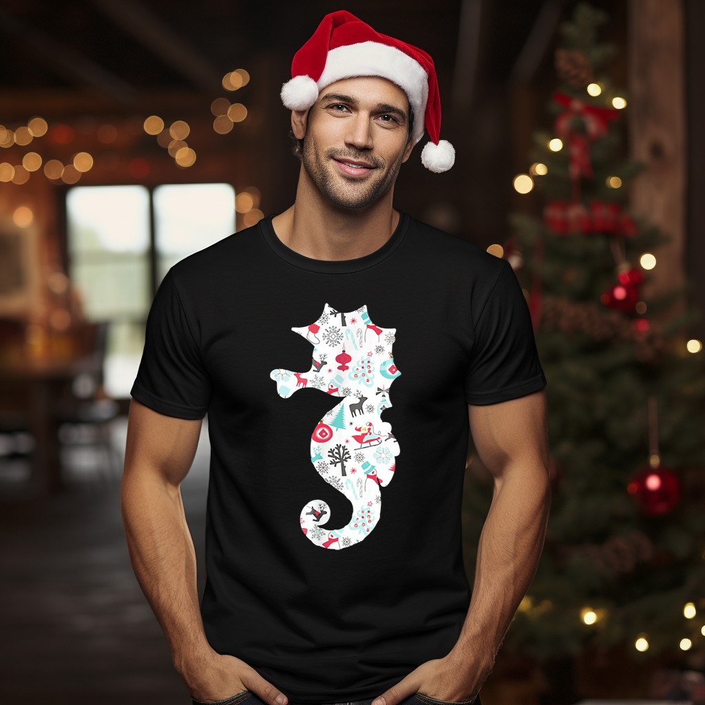 Celebrate the festive season in style with our Seahorse Christmas Pattern T-Shirt, designed for those who love to blend fun and holiday spirit! Perfect for family gatherings, holiday parties, or just lounging around, this shirt features a whimsical design of seahorses adorned with reindeer snowflakes and a skiing Santa, making it a unique addition to your casual wear collection. With its soft, breathable fabric and classic fit, it’s the perfect choice for anyone looking to spread cheer and showcase their love for the ocean during the holidays.