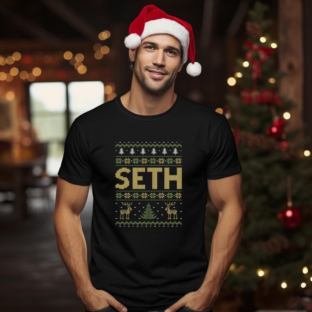 Get into the holiday spirit with our Seth Ugly Christmas Sweater T-Shirt, featuring a playful reindeer and tree design that brings festive cheer to any casual occasion. Perfect for holiday gatherings, themed events, or simply spreading joy throughout your daily wear, this fan-made graphic tee is printed in the USA for quality you can trust. With its classic fit and soft cotton fabric, it’s the ideal choice for those who love to celebrate the season in style.