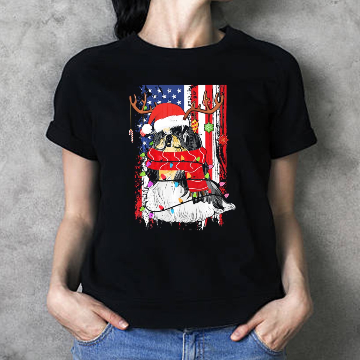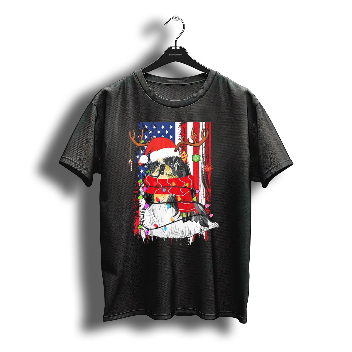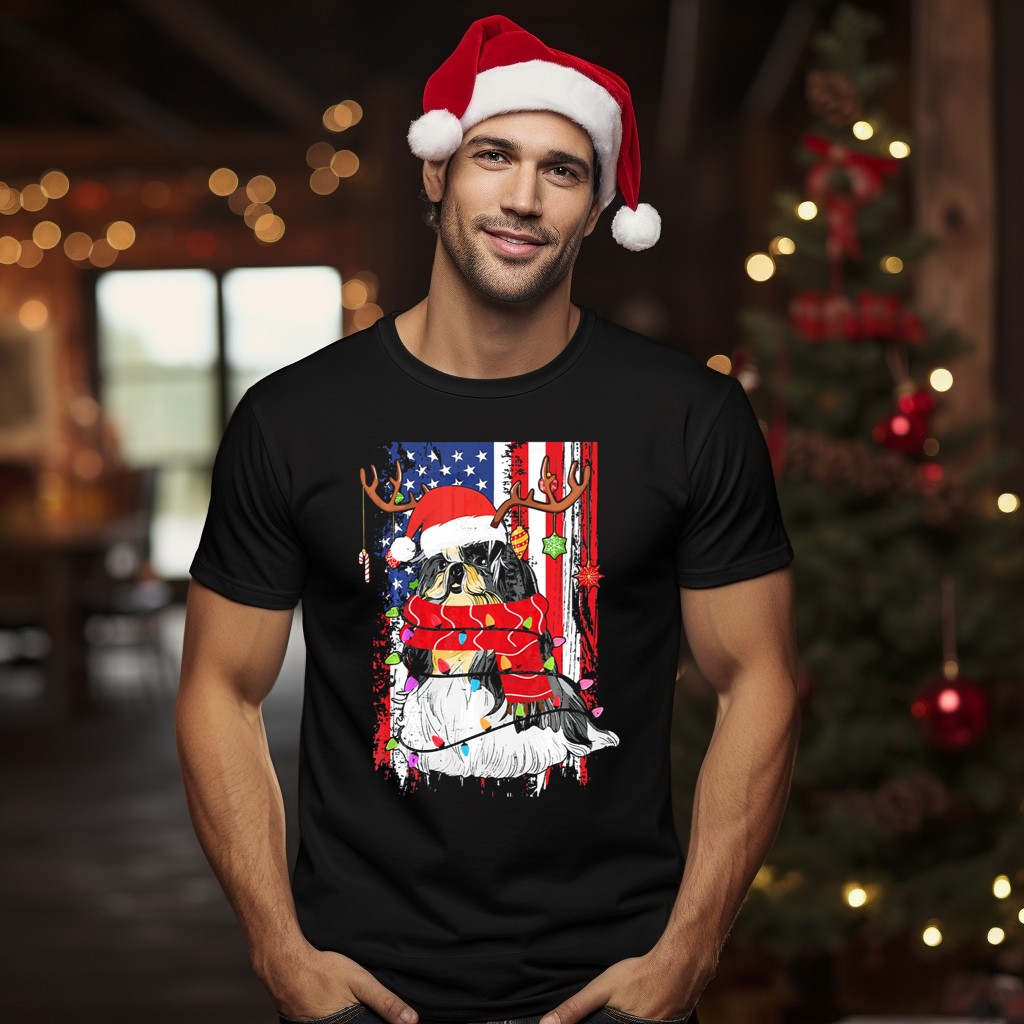 Celebrate the festive season with our Shih Tzu With Antlers And Santa Hat Christmas Lights USA Flag Background T-Shirt! This playful and unique design is perfect for dog lovers and holiday enthusiasts alike. Whether you’re attending a themed event, casual get-together, or simply spreading holiday cheer, this shirt will keep you looking stylish and fun. Made with care in the USA, it’s a great way to showcase your love for your furry friend and the holiday spirit!