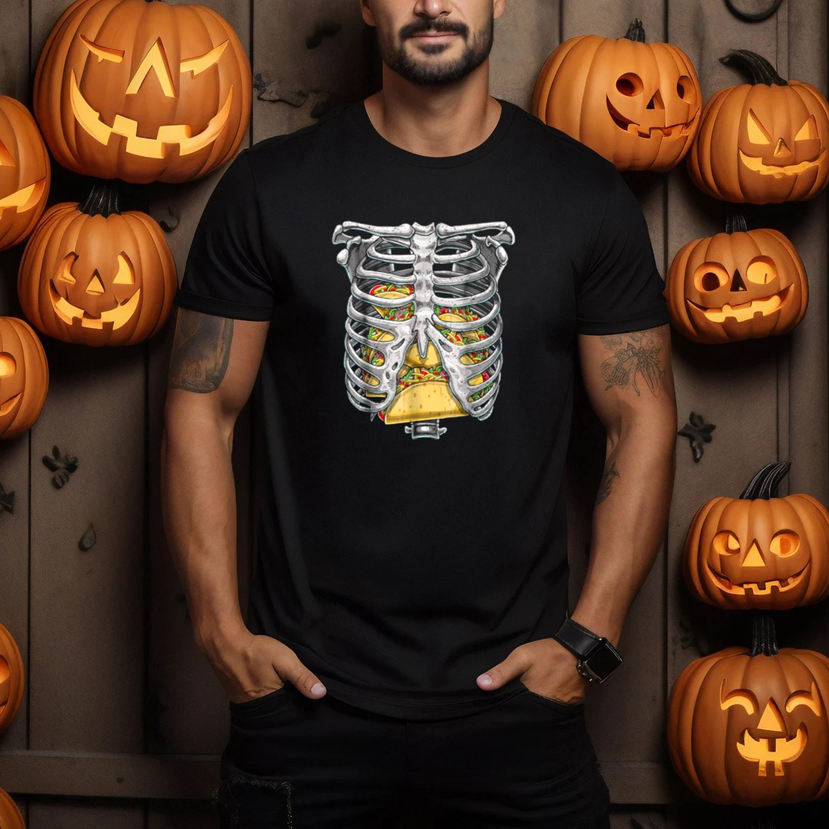 Celebrate Halloween in style with our Skeleton Rib Cage Taco T-Shirt! Perfect for taco lovers and skeleton enthusiasts alike, this fun and quirky design is ideal for themed events, casual outings, or just adding a bit of humor to your daily wear. Made for comfort and durability, this fan-made graphic shirt is printed right here in the USA, ensuring you stand out in any crowd.