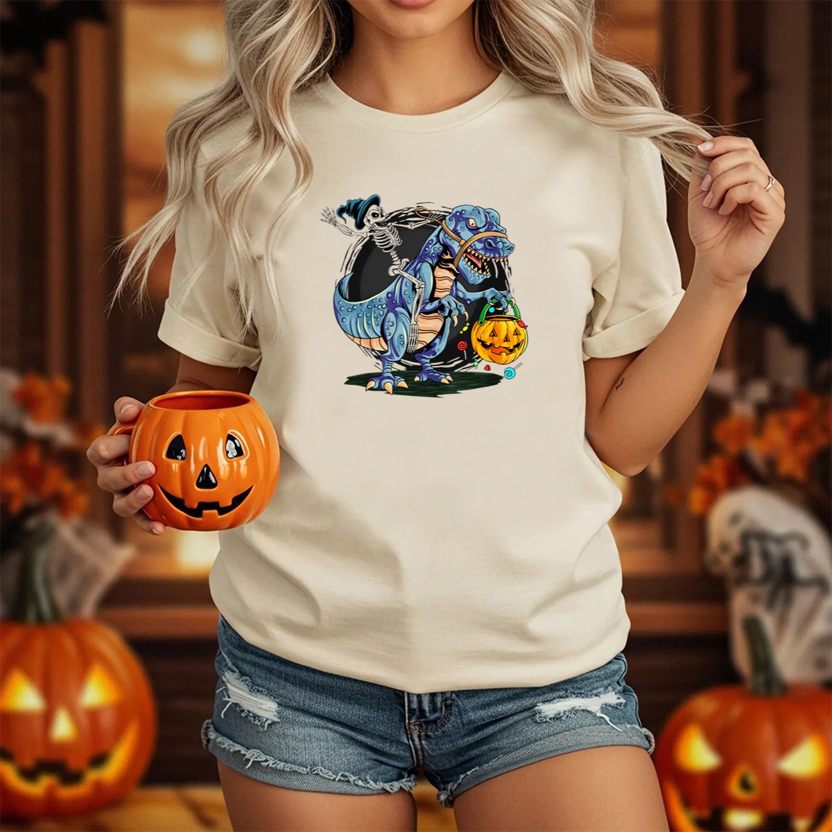 Be the first to review “Skeleton Riding Dinosaur Halloween Candy Pumpkin Monster T-Shirt”