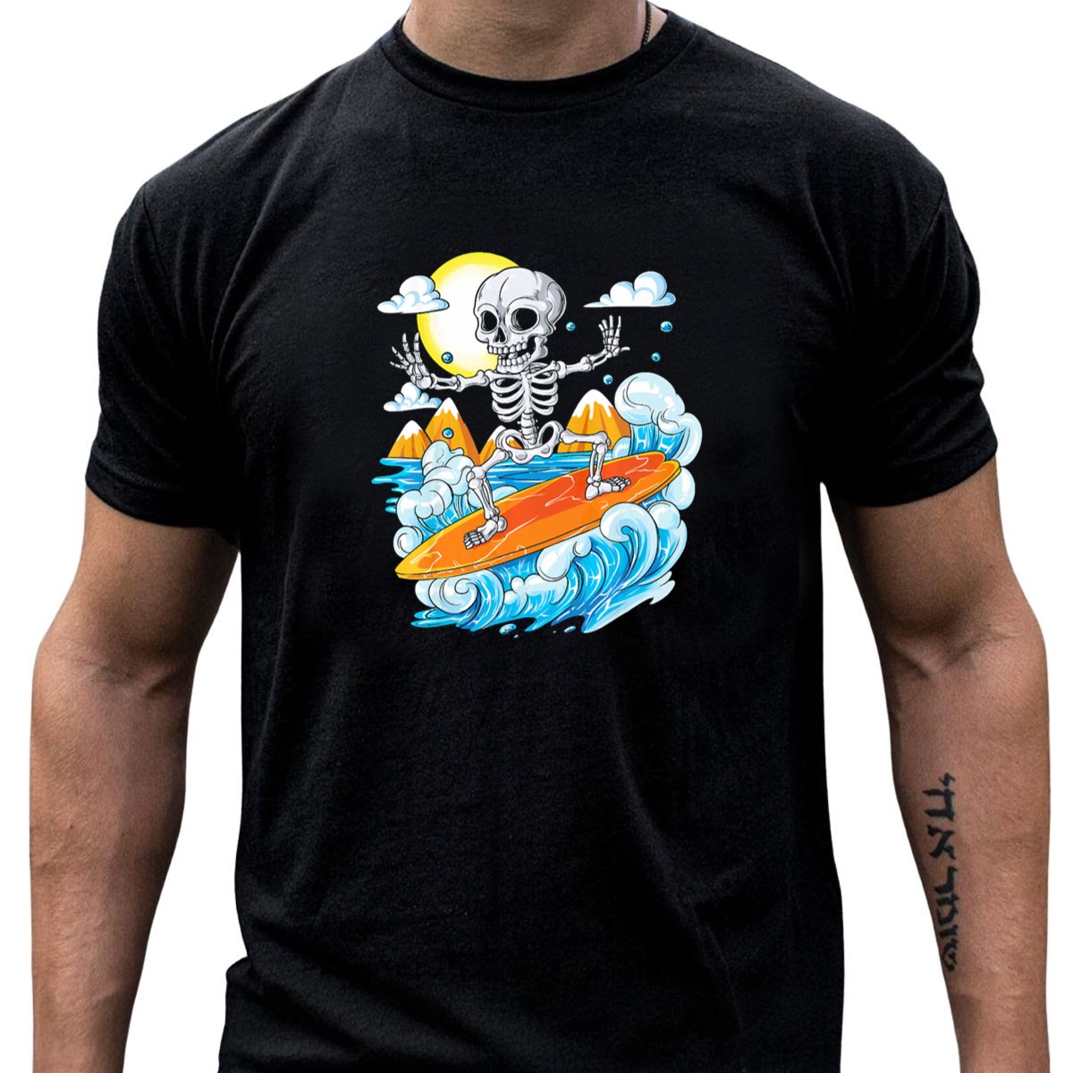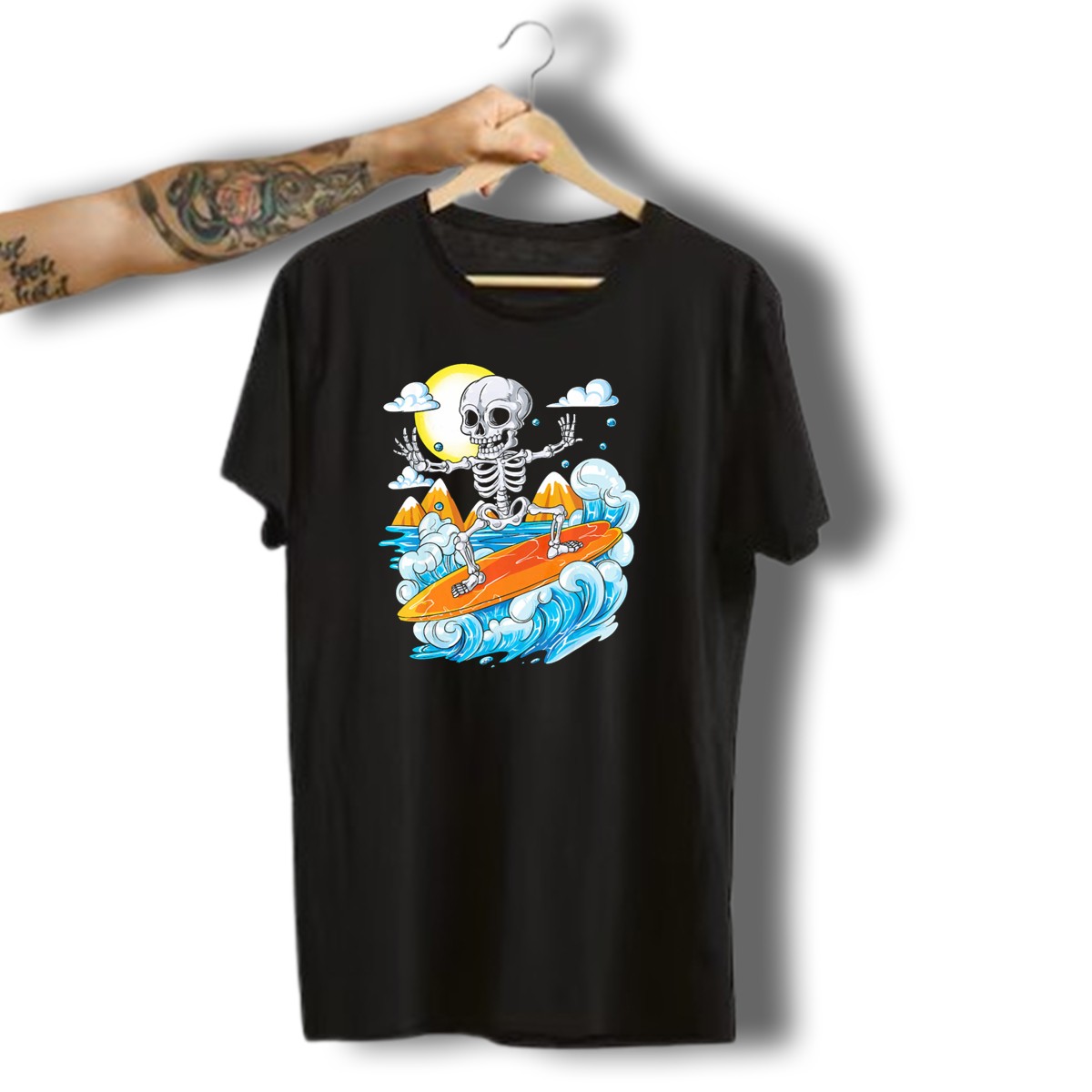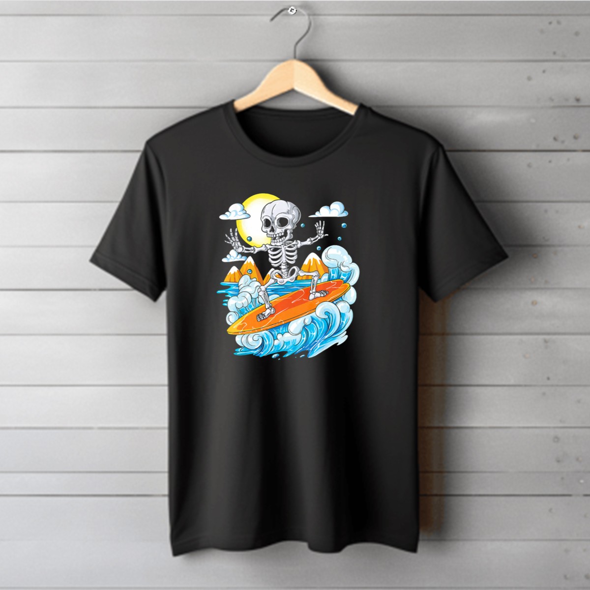 Be the first to review “Skeleton Surfing Halloween On Hawaiian Waves With Sun And Clouds T-Shirt”