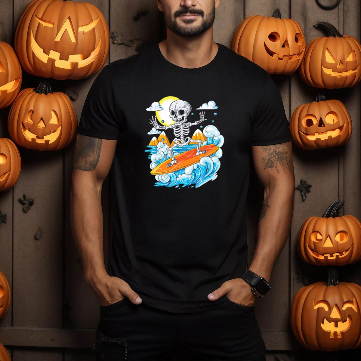 Embrace the spirit of Halloween with our Skeleton Surfing T-Shirt, perfect for those who love to combine festive fun with a laid-back vibe. This unique design features a lively skeleton catching waves under a sunny sky, making it ideal for casual outings, themed events, or just hanging out with friends. Made for anyone who enjoys a touch of humor in their wardrobe, this fan-made piece is printed right here in the USA, ensuring you stand out in style!