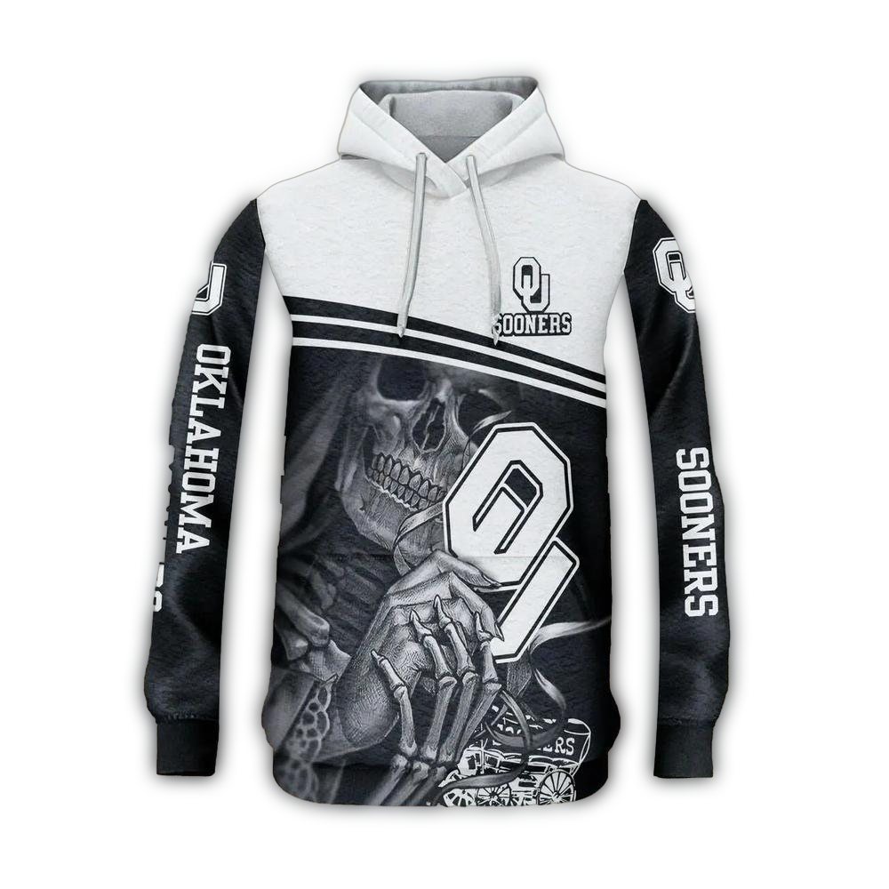 Elevate your casual style with the Skull Death Hold Logo Oklahoma Sooners White and Black AOP Hoodie, perfect for passionate fans who want to showcase their team spirit. This unique hoodie combines comfort and a bold graphic design, making it an ideal choice for daily wear or laid-back outdoor activities during the chillier months. With its relaxed fit, it’s designed for everyone, ensuring you stay cozy while cheering on your favorite team.