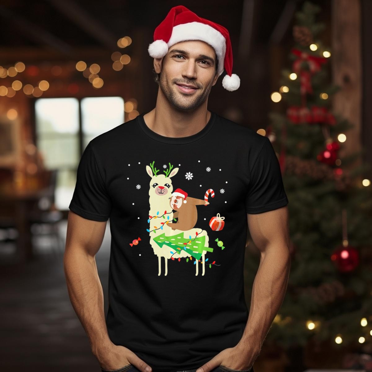 Be the first to review “Sloth Santa Riding A Llama With Candy Cane And Christmas Lights T Shirt”