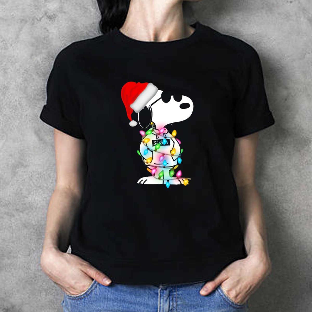 Be the first to review “Snoopy Santa Hat Wrapped In Christmas Lights Sunglasses Smirk T-Shirt”