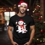 Be the first to review “Snowman With Santa Hat And Scarf Holding Wine Glass And Bottle Christmas Drinking T-Shirt”