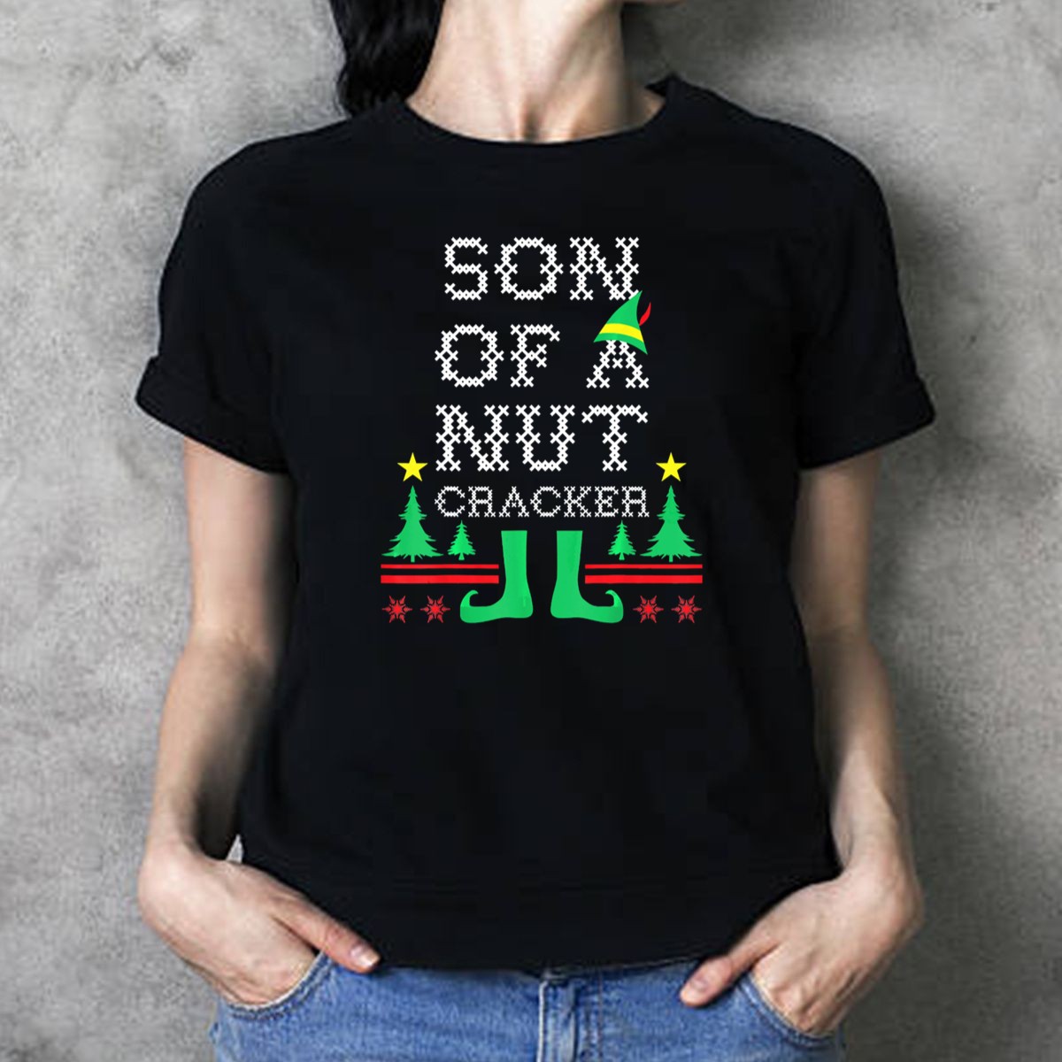 Son Of A Nutcracker Ugly Christmas Elf Hat Trees Stars Snowflakes T-Shirt